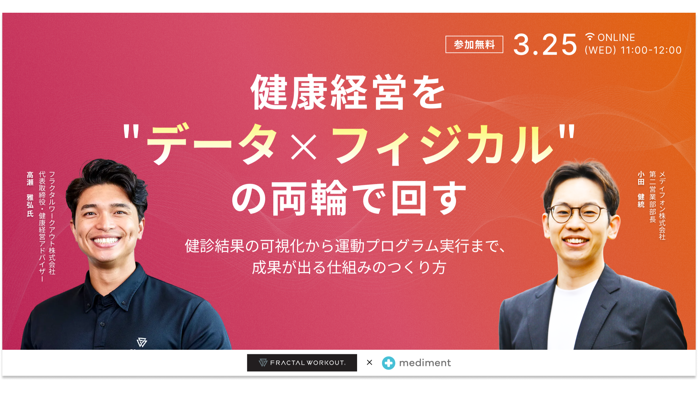 本セミナーでは、メディフォン株式会社が担う健康管理基盤の整備と、フラクタルワークアウト株式会社が担う運動施策の設計・実行支援を接続し、把握だけで終わらない健康経営の進め方を提示します。