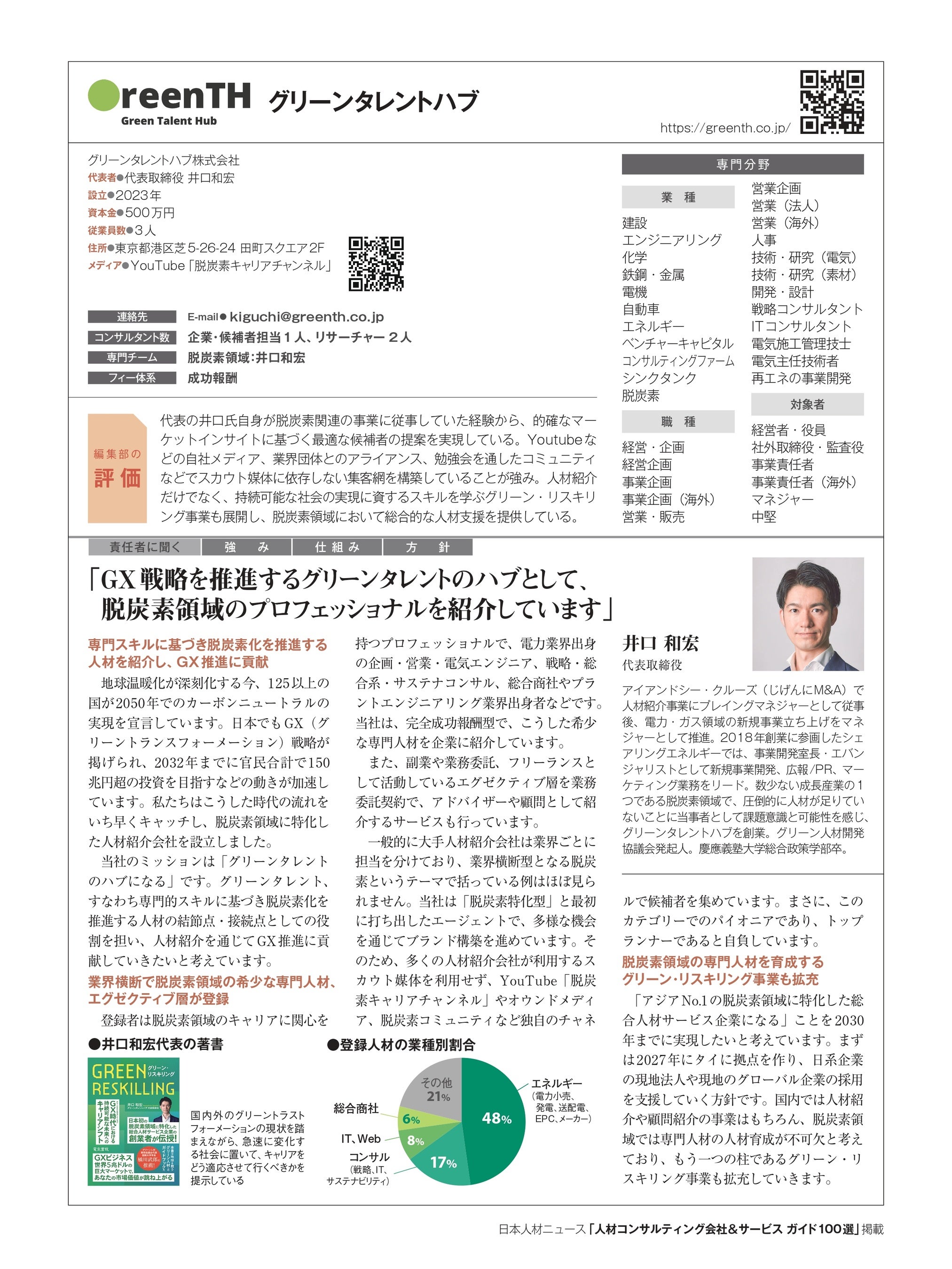 人事専門誌「日本人材ニュース」を発行する株式会社日本人材ニュース社(東京都千代田区、代表取締役:吉越利成)は、企業の人材採用を支援できる優れたコンサルティング会社とサービスを紹介する「人材コンサルティング会社&サービスガイド100選」に、グリーンタレントハブ(東京都港区、井口和宏代表取締役)が参画したことをお知らせいたします。