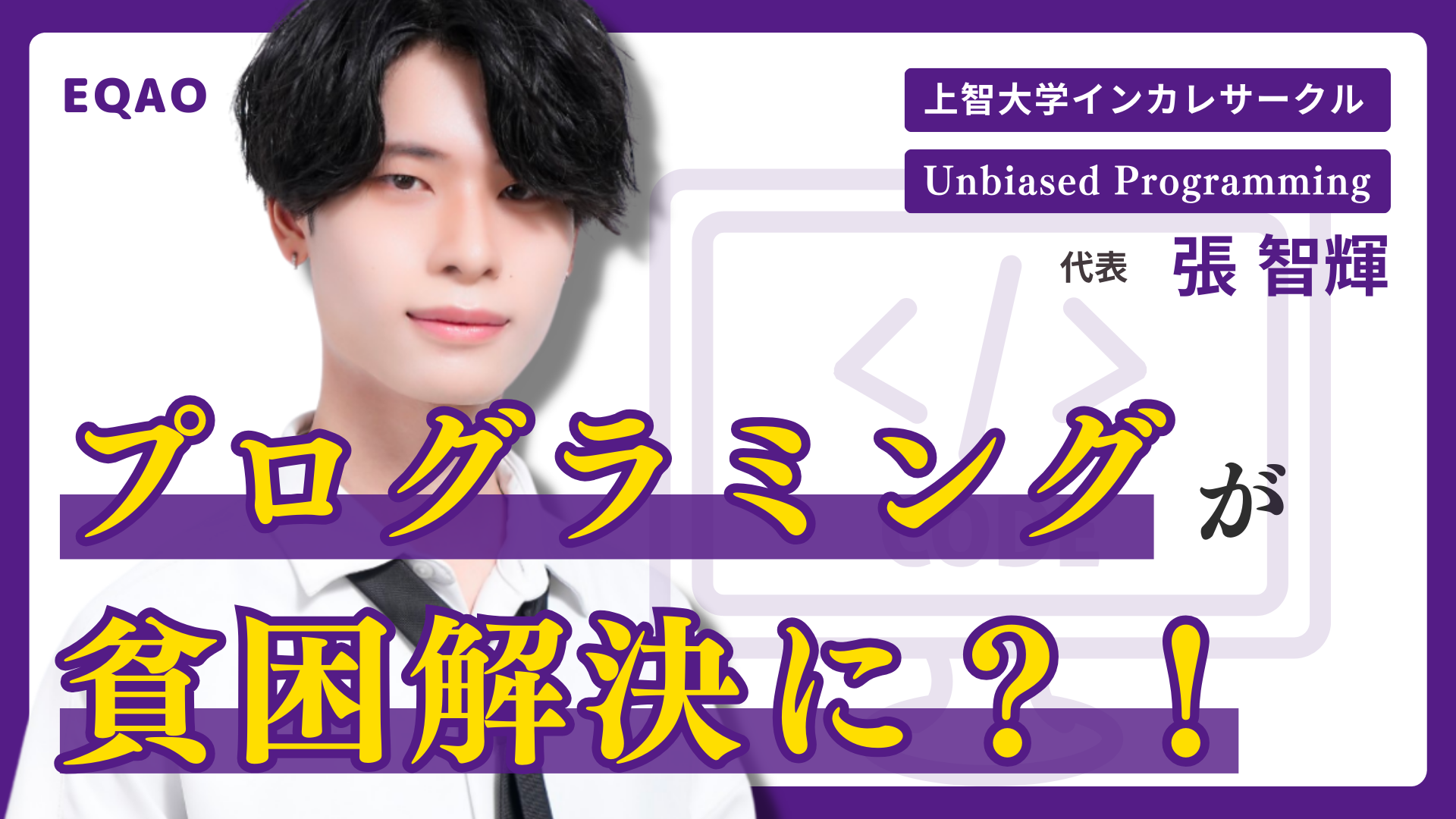 上智大学インカレサークルUnbiased Programming代表の張 智輝です。プログラミングをより多くの人に身近に感じていただくために、Unbiased Programmingの設立をはじめ、NPO法人Unbiased Learningでの活動など、様々な取り組みを行っています。その取り組みの一環として参加したソフィアンズコンテスト2023では、私と同じく上智大学生である玉村さんがCEOを務める塾、EQAOにご協賛いただきました。その際、EQAOからクライアント賞をいただいたことをきっかけに、Unbiased ProgrammingとEQAOで、非認知能力向上×プログラミングという革新的なイベントを企画する運びとなりました。今回が記念すべき第一回のイベントです。