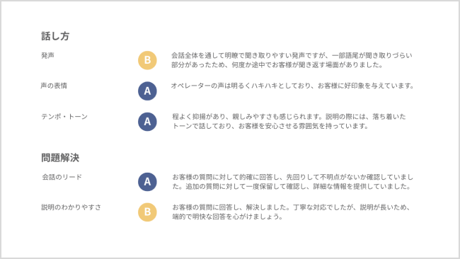 AIが通話音声と応対のテキストデータを解析し、「話し方の正しさ」「声の印象」「文脈に応じた適切な発言」などの観点から総合的に評価します。その結果をもとに、オペレーターの強みや改善点を具体的に記したフィードバックカルテを生成。応対1件ごとの評価カルテに加え、1か月単位での総合評価レポートも出力できるため、日々の指導から月次の振り返りまで一貫した品質マネジメントを確立します。今まで人が経験や感覚をもとに作成していたコメント内容を再現し、的確かつ再現性の高い指導を可能にします。