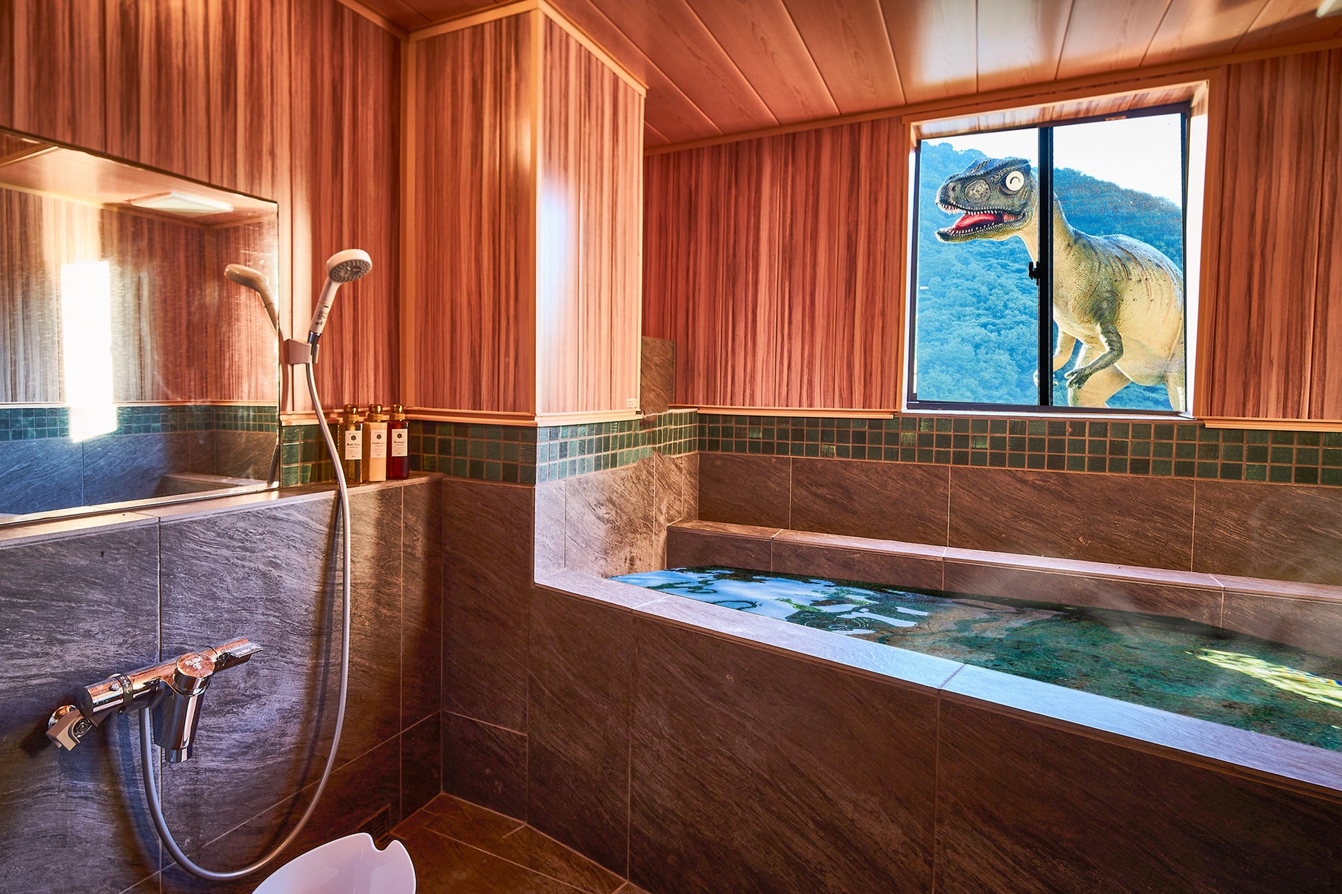 天童温泉の最大湯量を誇る大浴場には、内風呂、露天風呂、バレルサウナが完備。さらに、「恐竜風呂」や「ほたる風呂」など、7種類の貸切風呂も無料でご利用いただけます。