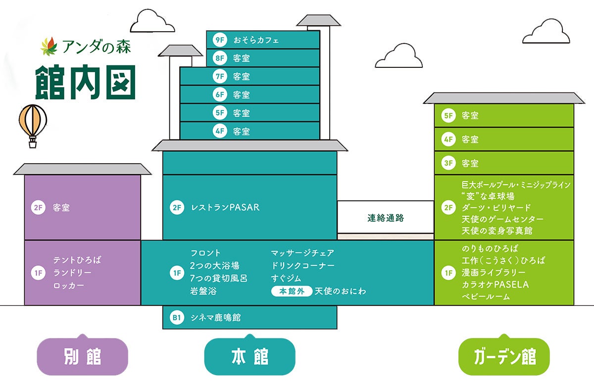 ■合計13,000平米の広々施設!ホテル アンダの森 山形天童店 館内図