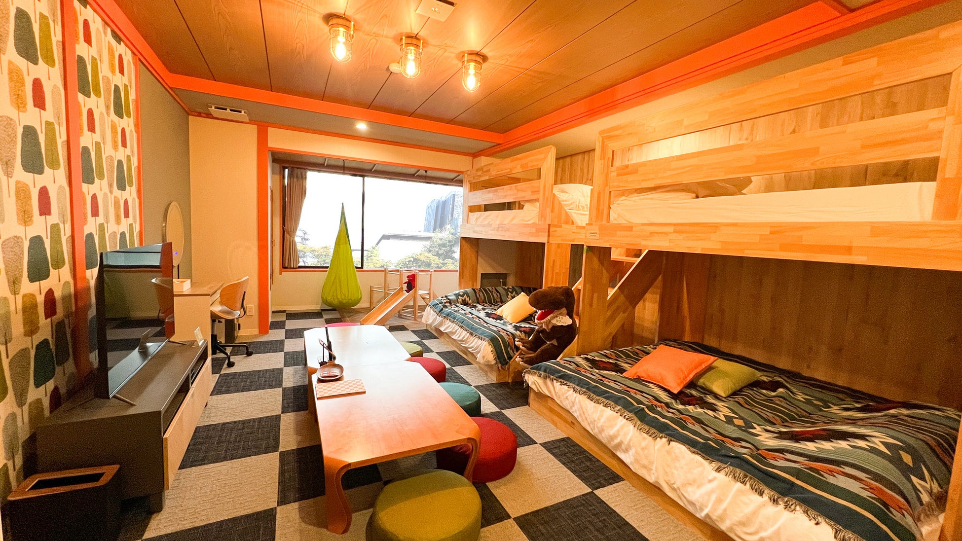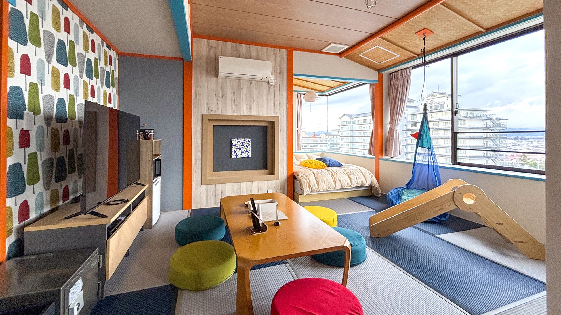 角部屋・遊具つきの客室。窓からの景色が美しい客室