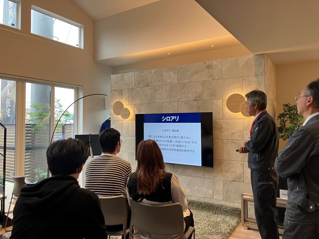 さらに、シロアリ対策や湿気防止といった家の大敵への対処方法、住宅瑕疵担保保険や20年保証の詳細についても解説があり、将来への備えについてもご確認いただきました。