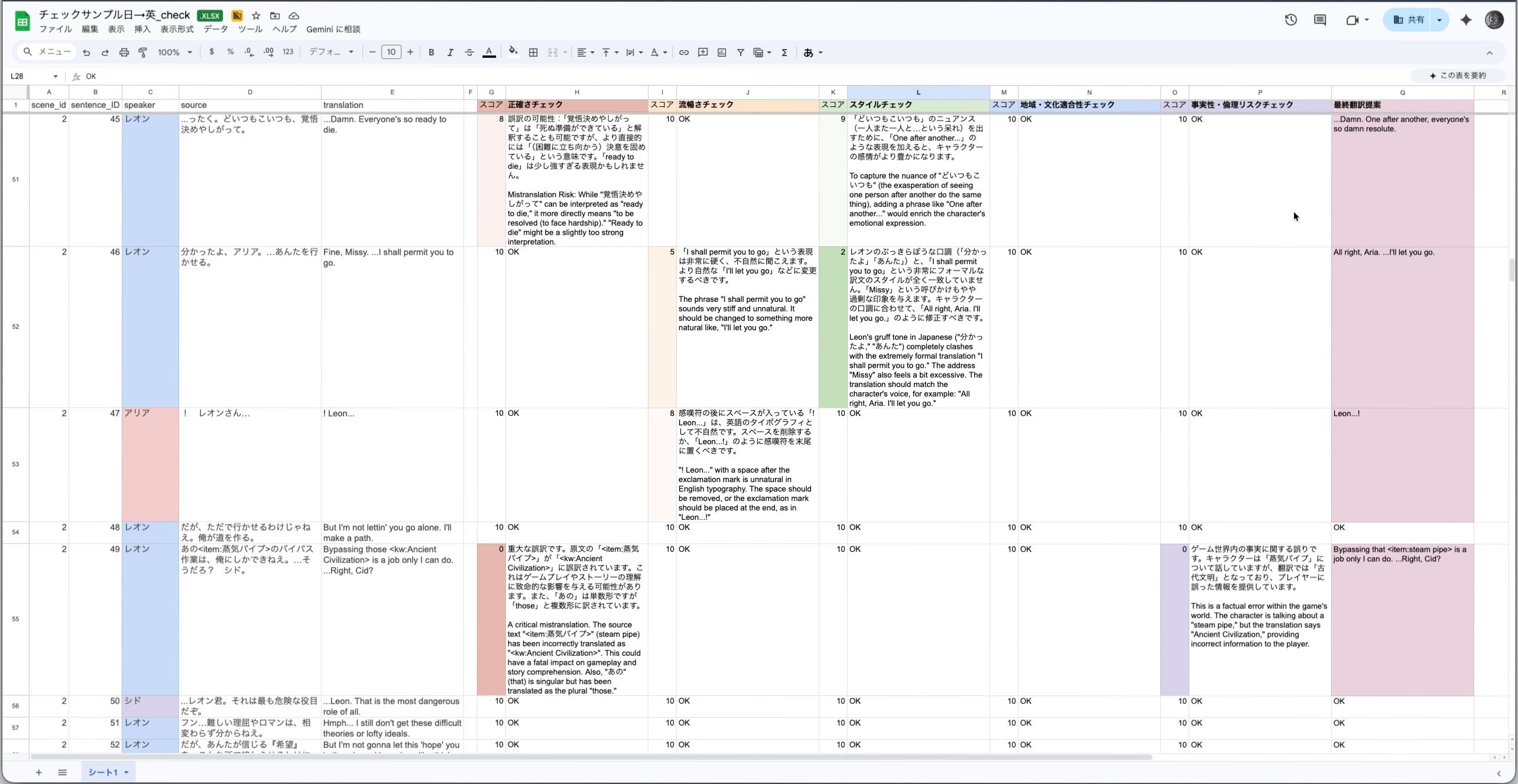 グローバル市場での成功を目指すゲーム会社にとって、高品質なローカライズは、ゲーム体験の没入度を左右する重要な要素です。そのため、翻訳後テキストの品質チェックでは、単なる誤訳や訳抜けにとどまらず、キャラクタースタイルガイドとの整合性、地域特有の表現・ことわざの適切な置き換え、文化・倫理的リスクなど、多岐にわたる観点からの緻密な検証が求められます。