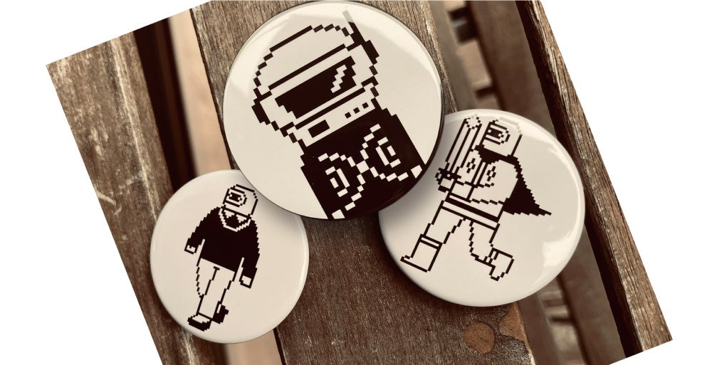 モノクロのドット絵作品をそれぞれ缶バッチ、ステッカー、アートフレームで展開。