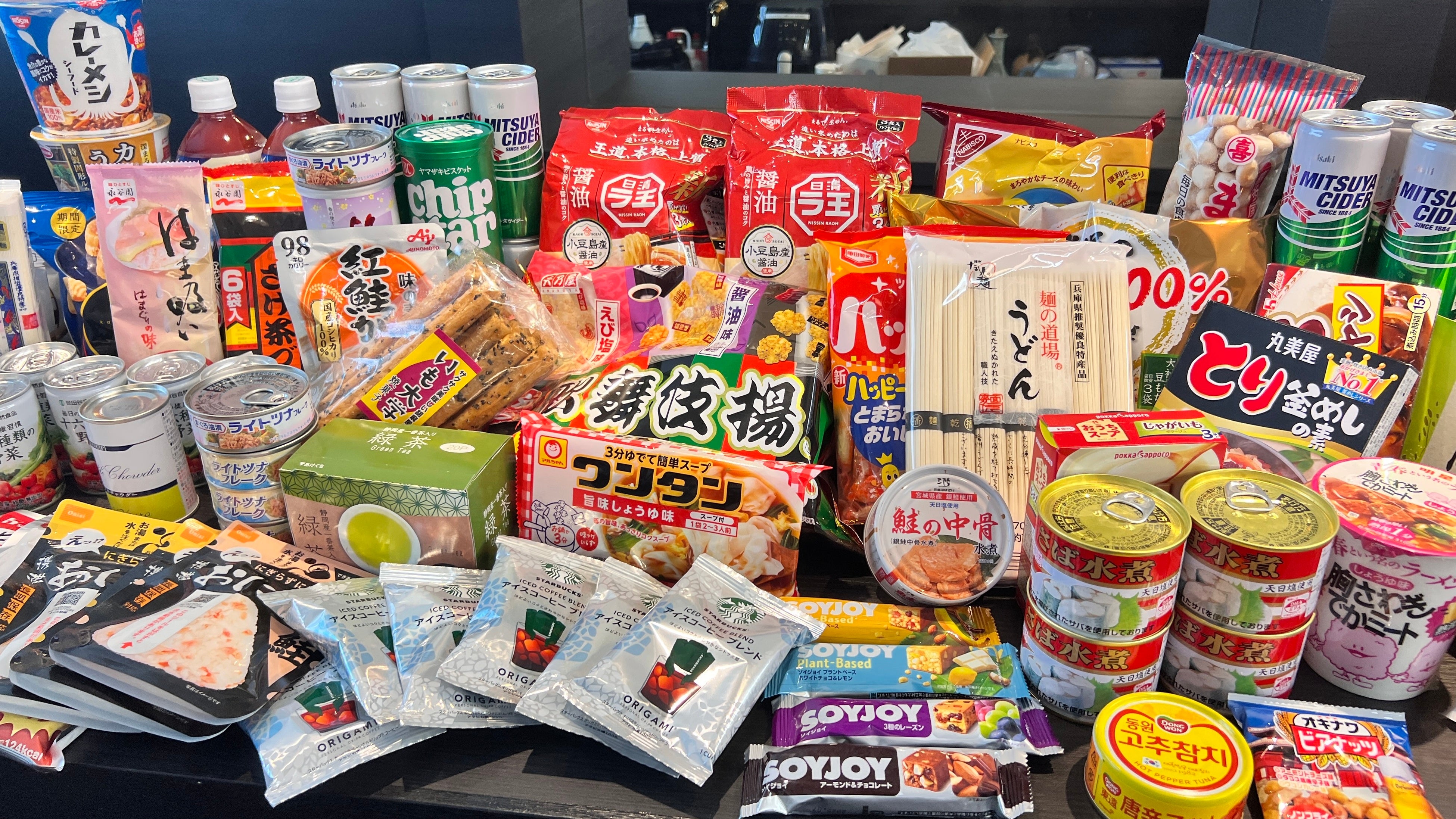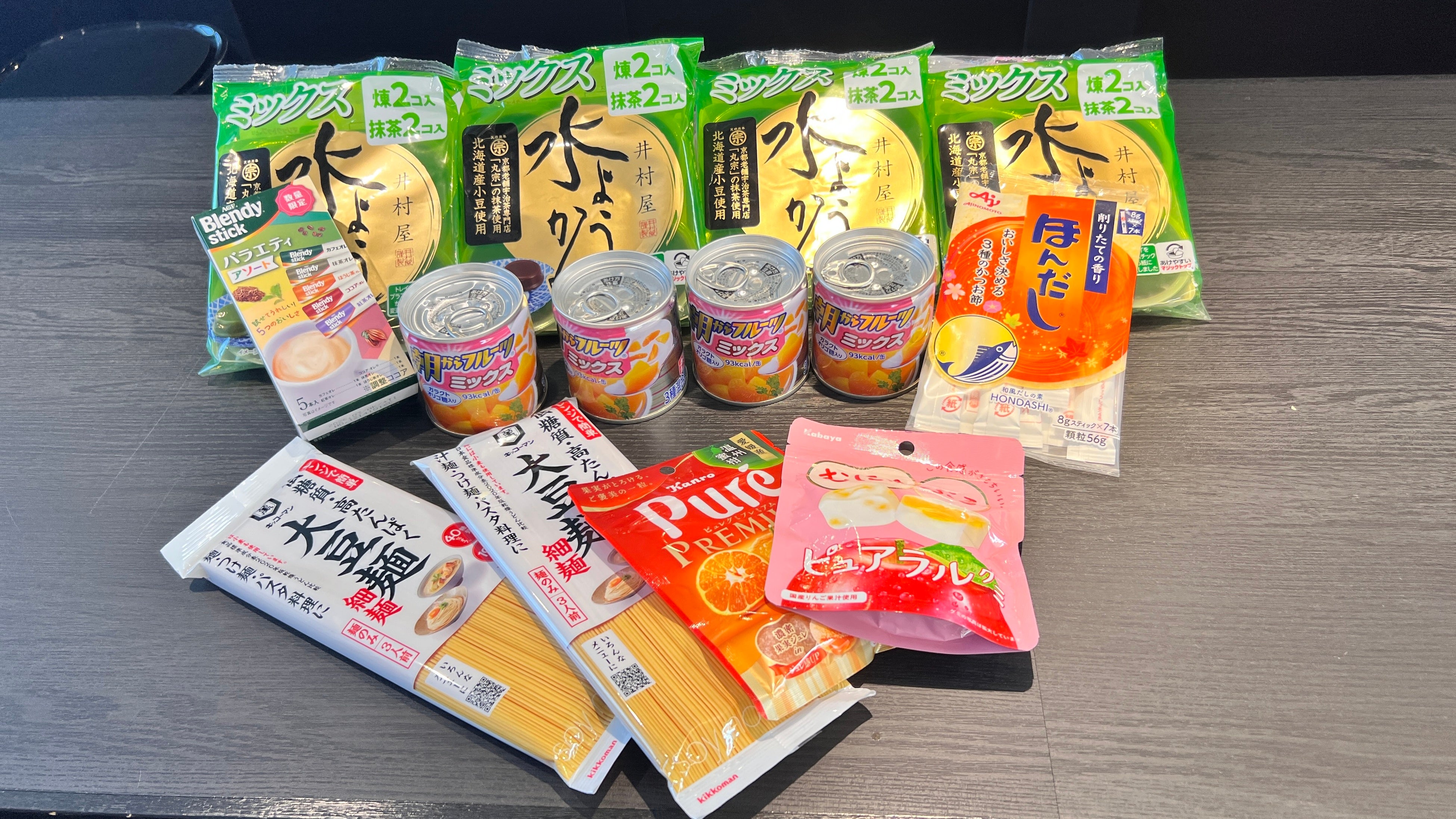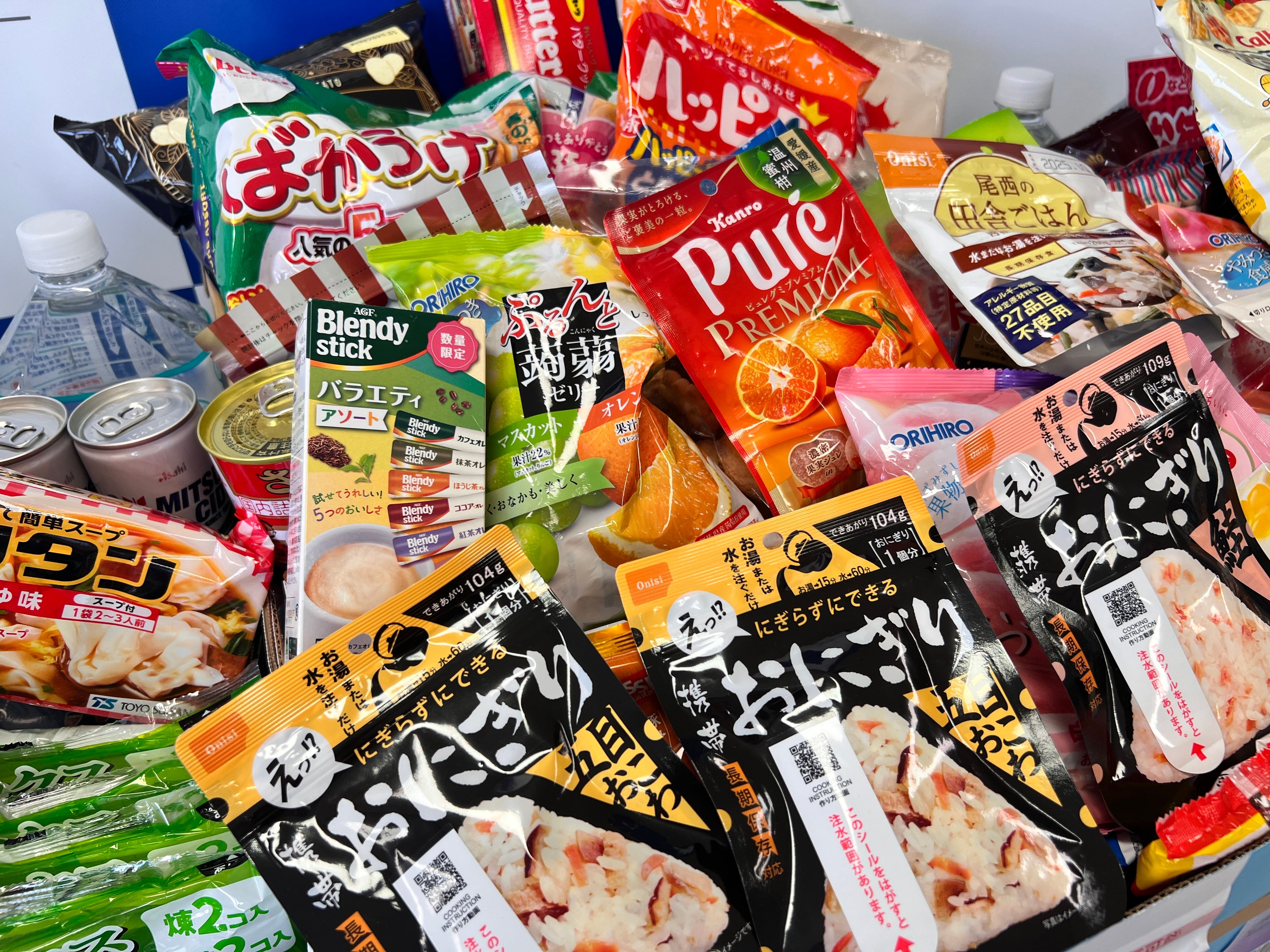 乾麺(そば、うどんなど)、カップ麺、スナック菓子、チョコレート、グミ、飲料(コーヒー、スポーツドリンク、清涼飲料、水など)、レトルト食品(カレー、おかゆなど)、缶詰、調味料(味噌、油など)