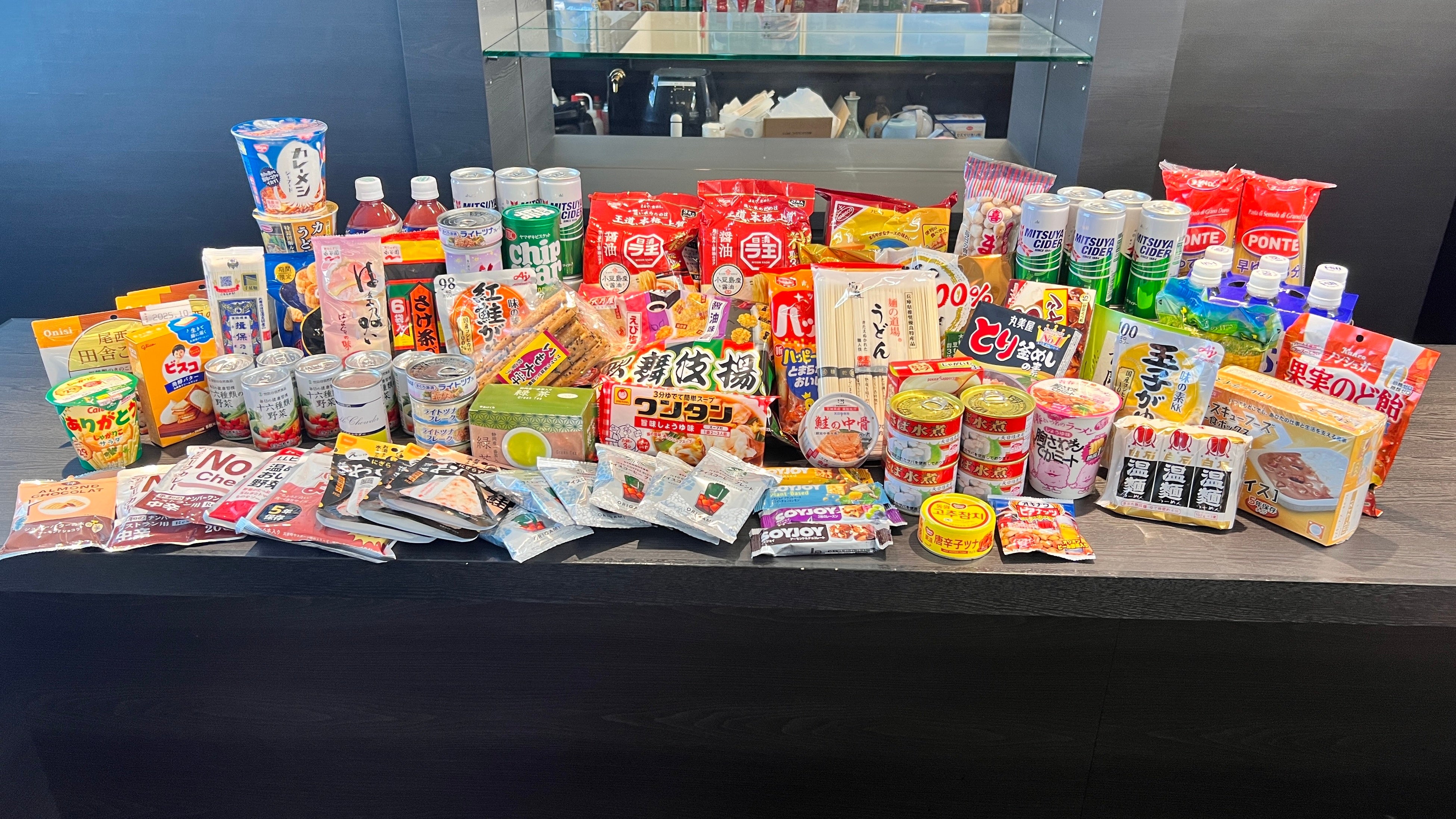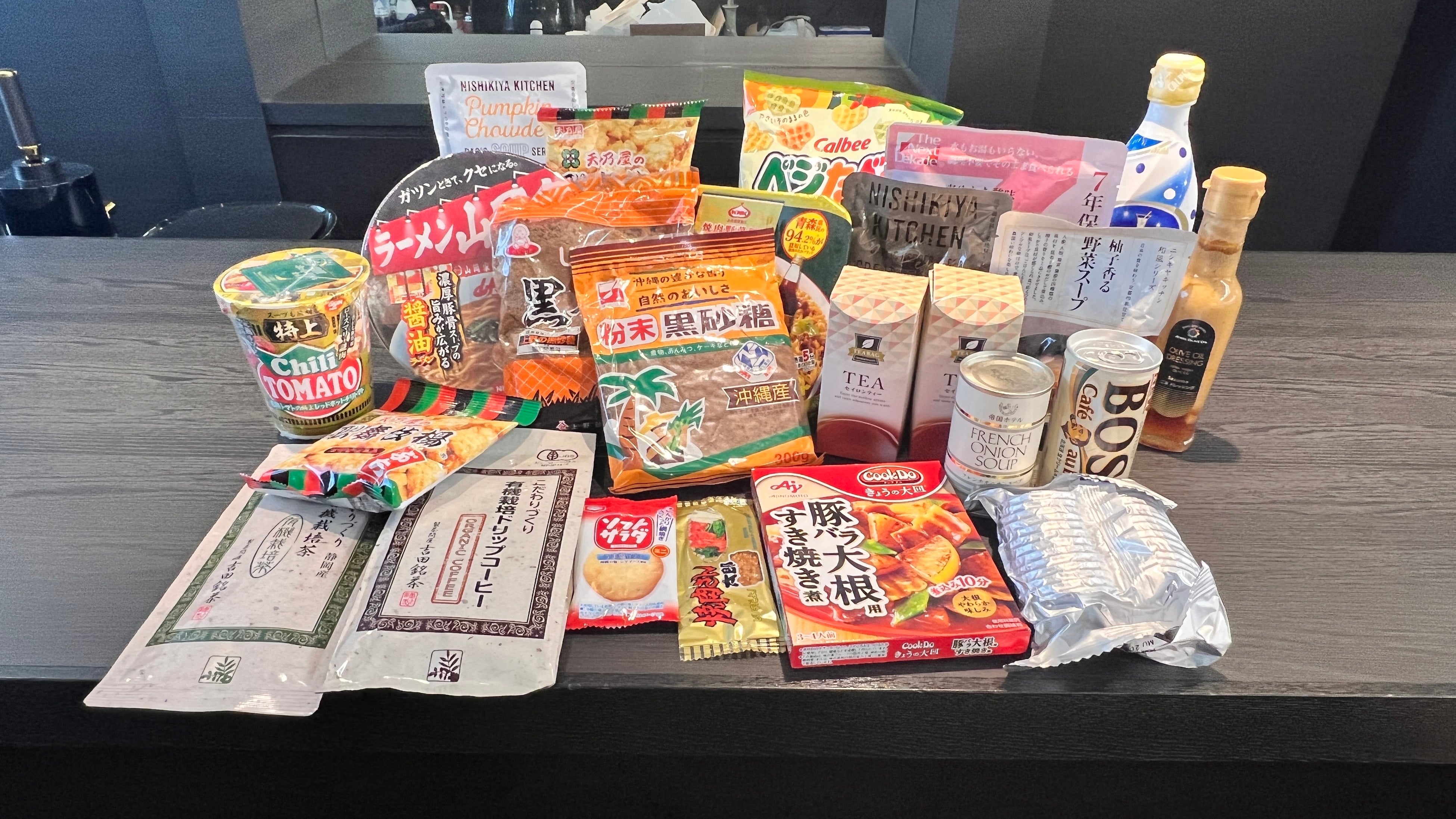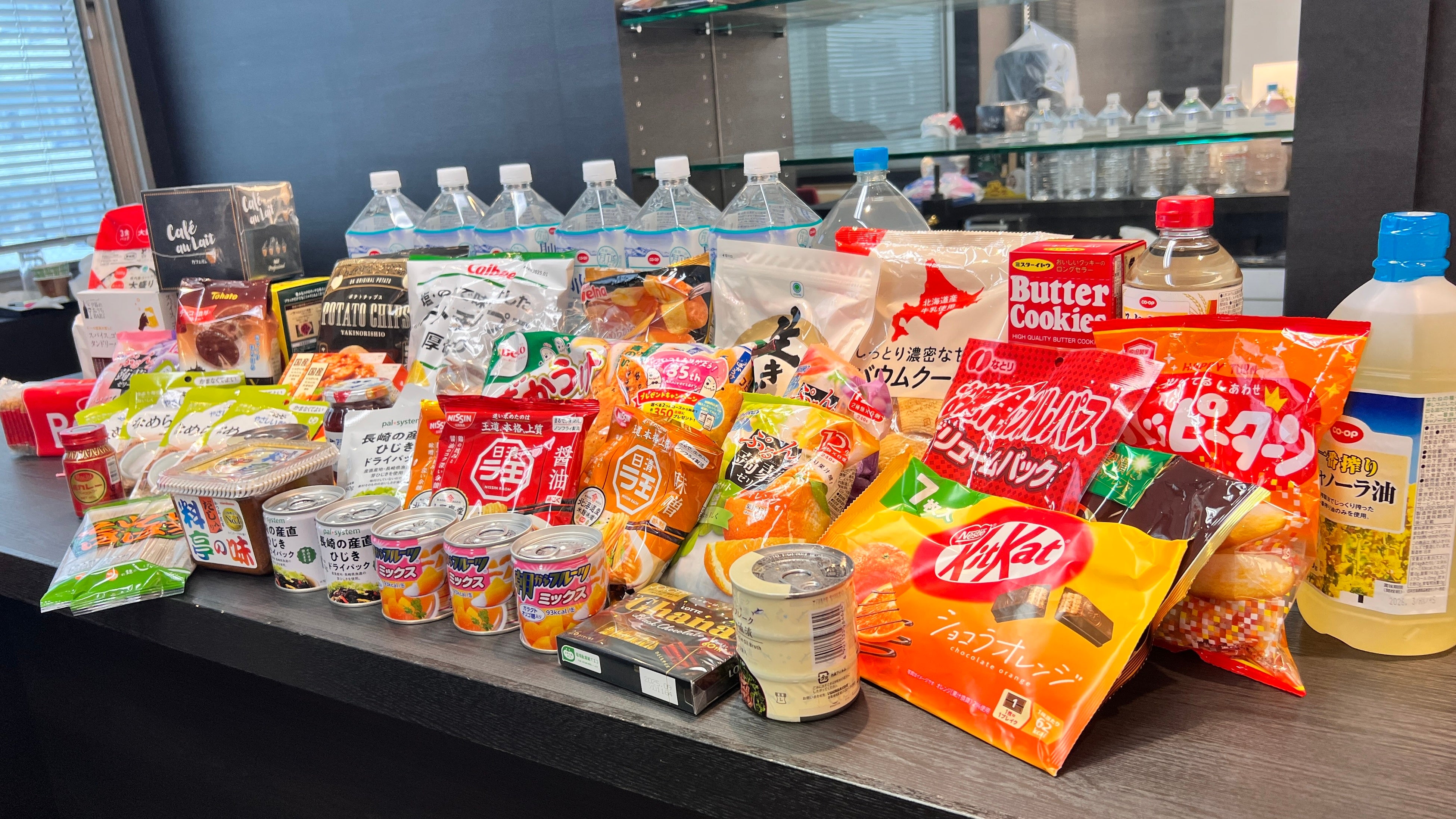 乾麺(そば、うどんなど)、カップ麺、スナック菓子、チョコレート、グミ、飲料(コーヒー、スポーツドリンク、清涼飲料、水など)、レトルト食品(カレー、おかゆなど)、缶詰、調味料(味噌、油など)