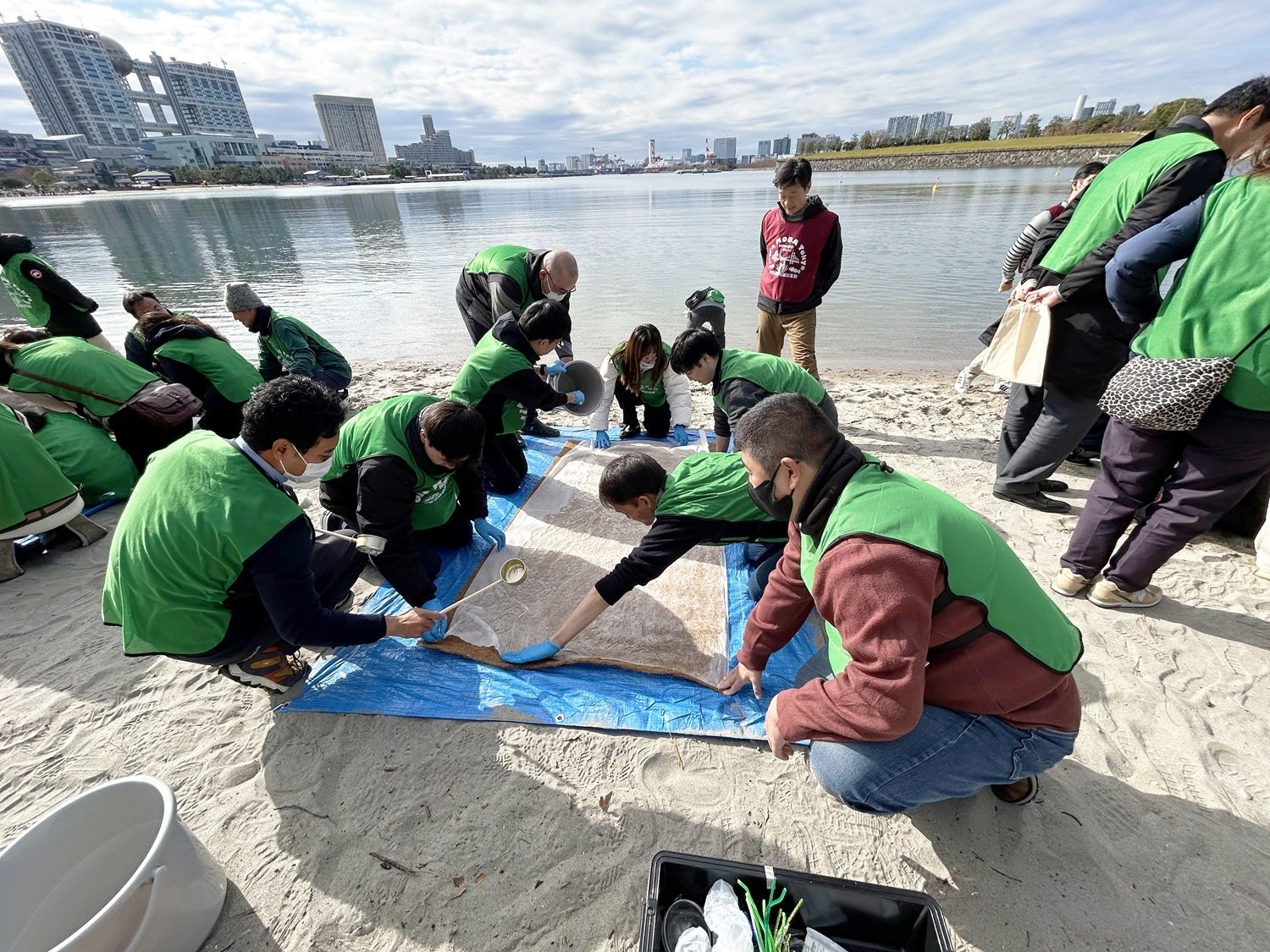 好天に恵まれた当日は、都民の方を中心に約200名が参加、当社社員も18名が参加しました。イベントでは、専門家によるアマモの学習セッションが行われた後、参加者が班に分かれて、当社が開発した生分解性不織布とヤシマットでできたアマモ播種(はしゅ)シートづくりを行いました。完成した播種シートは、ダイバーによって公園の沖合の海底に敷設されました。