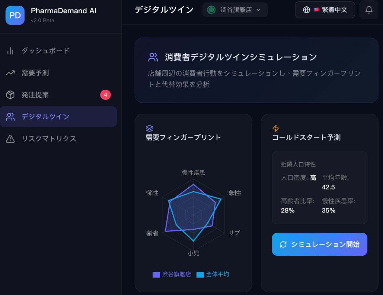 「PharmaDemand AI」は、小売薬局専用に設計されたAIネイティブ・プラットフォームです 。その核心は、「CDT (Consumer Digital Twin:消費者デジタルツイン)」モデルとPOS履歴データを融合させた独自のアルゴリズムにあります 。各店舗のSKU(最小管理単位)ごとに、将来7/30/90日間の需要変動を予測可能 。薬局経営の最優先課題である欠品リスクを解消するだけでなく、期限切れ医薬品の廃棄ロスを効果的に削減し、資産回転率を劇的に向上させます 。