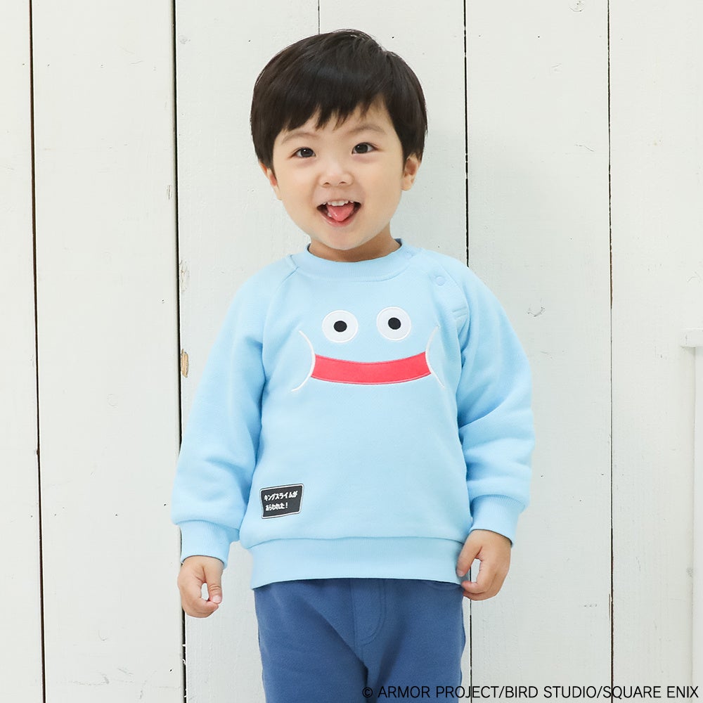 親子ではじめての冒険!「ドラクエベビー&キッズ」より、スウェットシャツの新デザインが登場です。キングスライムの顔が大きくデザインされた、インパクトのあるスウェットシャツです。背中側にはキングスライムの王冠がプリントされています。さりげなくデザインされたメッセージウィンドウも、遊び心があってドラゴンクエストの世界観が広がります。