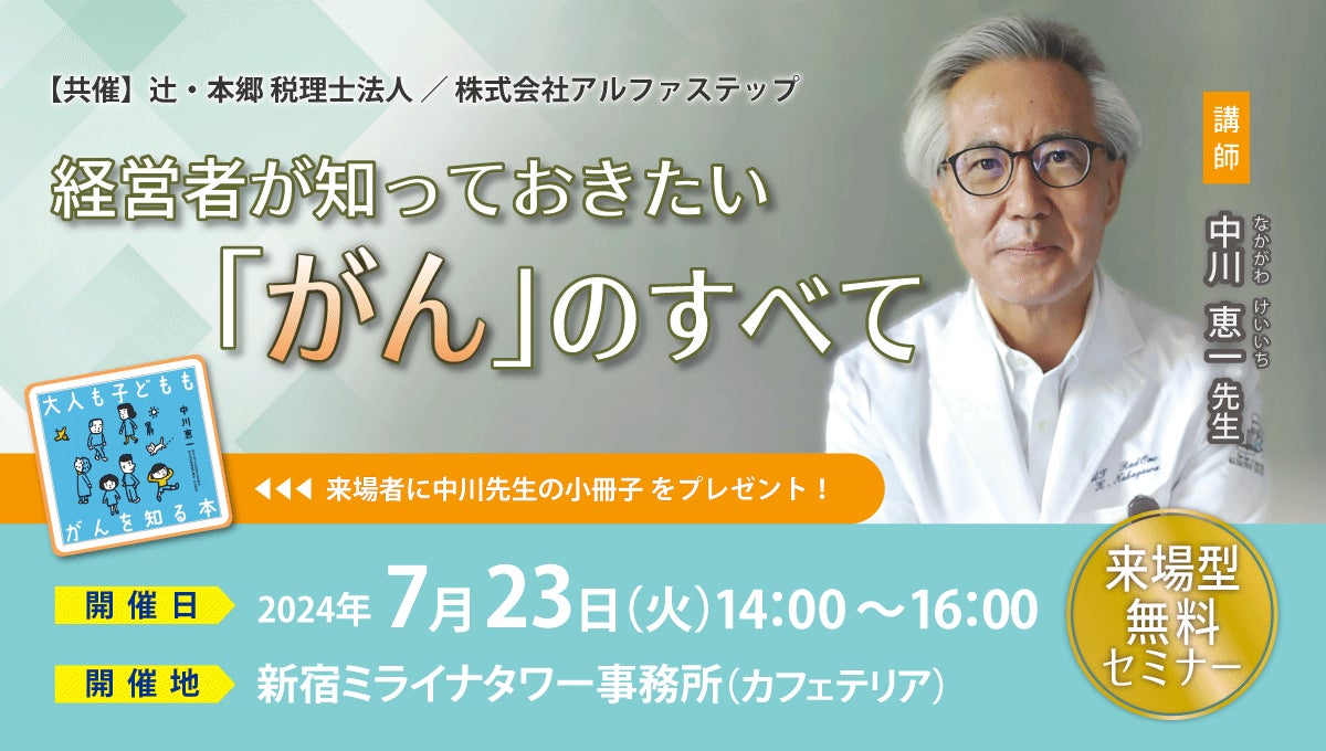 辻・本郷 税理士法人(本社:東京都新宿区、理事長:徳田孝司)は、株式会社アルファステップ(本社:東京都新宿区、代表取締役:本郷孔洋)と2社共催で「経営者が知っておきたい『がん』のすべて」セミナーを 2024年7月23日(火)に開催いたします。日本を代表するがんの専門医である中川恵一先生をお招きし、経営者のみなさまに知っていただきたいがんの知識(予防・健診、リスクと備え方)について、事例と共にお話しいただきます。また、実際に経営者ががんに罹患した場合に直面するおカネの問題について、税理士を交えたパネルディスカッションを実施します。