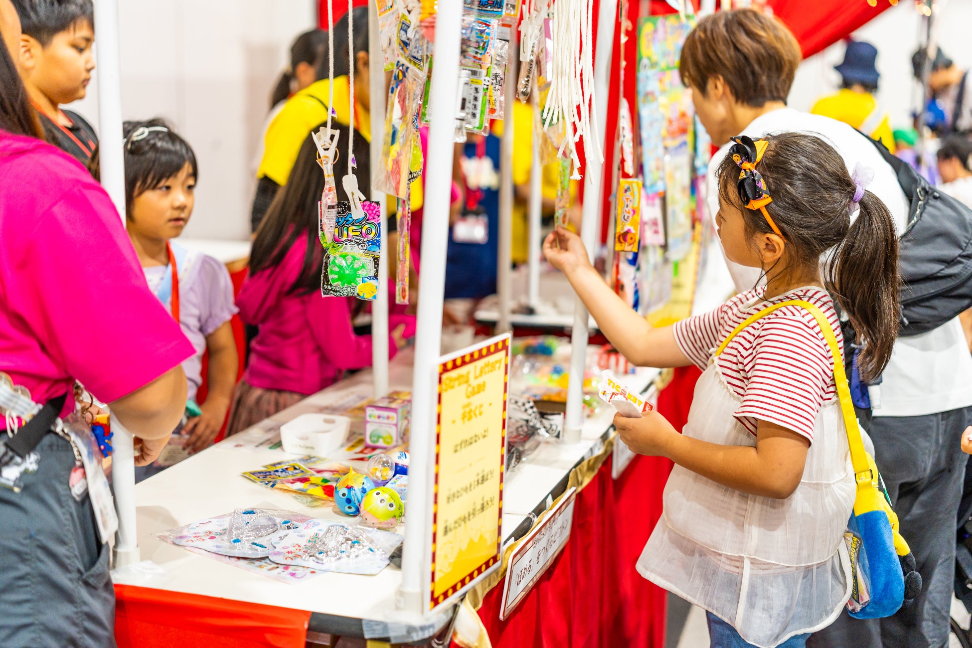 子どもたちが縁日の店長となって接客やサービス提供を行う、こども万博の象徴的なコンテンツです。射的、ヨーヨー釣り、千本くじなどの縁日を子どもたちが店長となって運営します。大人が用意した体験をするのではなく、子ども自身が主体的に行動し、困りごとを周りと協力して解決する力を養います。ストライプ柄の屋台やサーカスをイメージした装飾で、会場を明るい雰囲気に彩ります。(※店長体験は事前予約制)