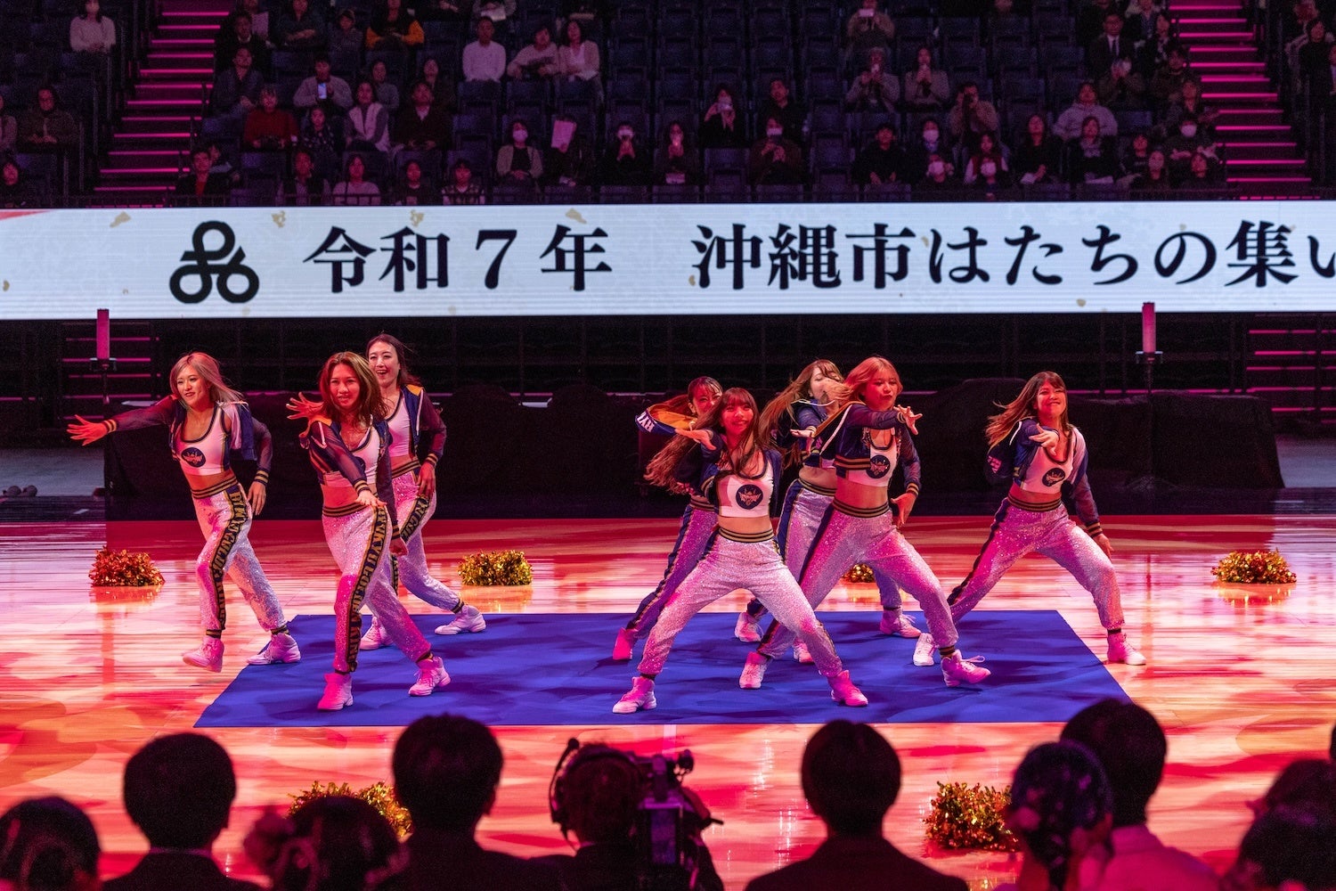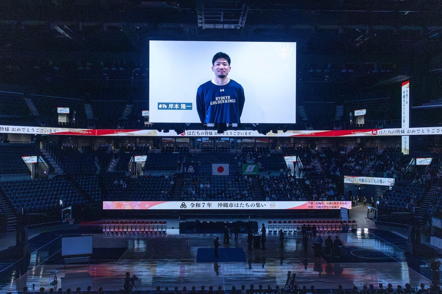 第2部では、沖縄県出身の琉球ゴールデンキングス #14 岸本隆一選手や、車いすマラソンランナーの上与那原寛和選手からのビデオメッセージが披露されました。さらに、国内女子バスケットボール「大樹生命Wリーグ沖縄開催」に出場するENEOSから沖縄市出身の佐久本智監督、シャンソン化粧品からは沖縄県出身の知名祐里選手が登壇し、新成人へのあいさつを行いました。また、沖縄市のホームチームである琉球ゴールデンキングスのキングスダンサーズがパフォーマンスを行い、式典に華を添えました。