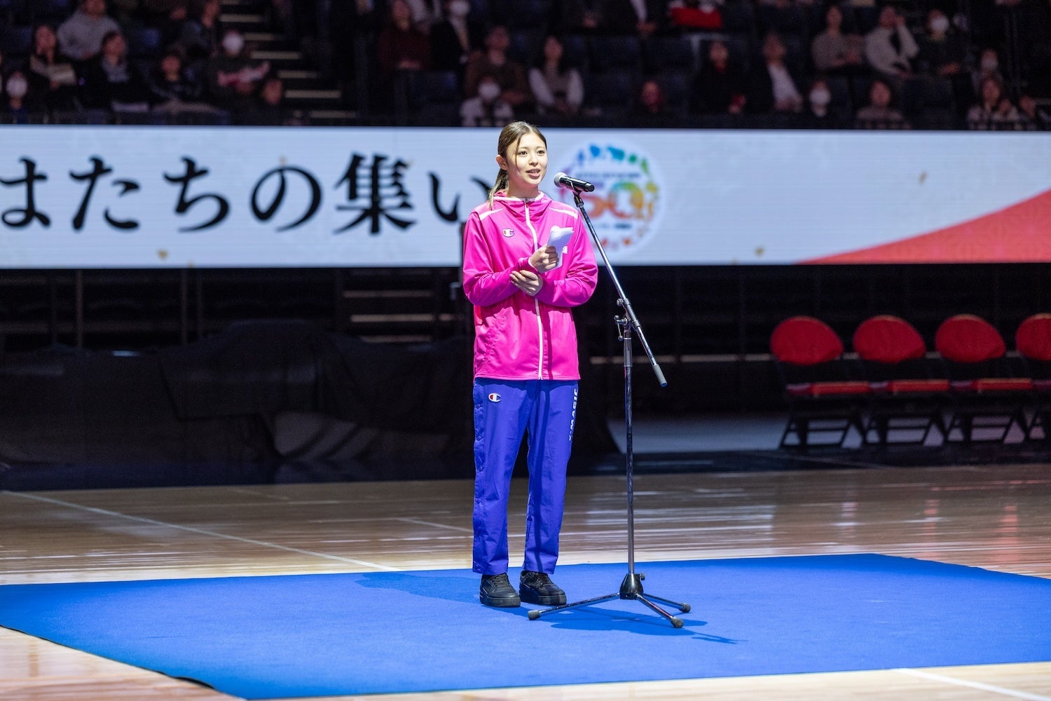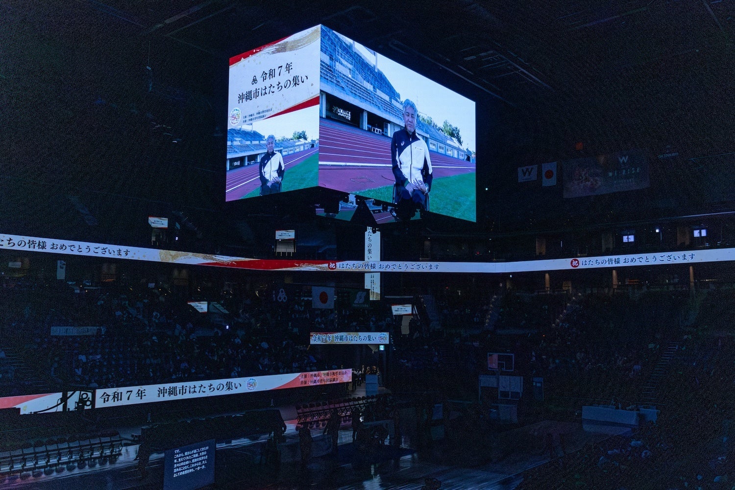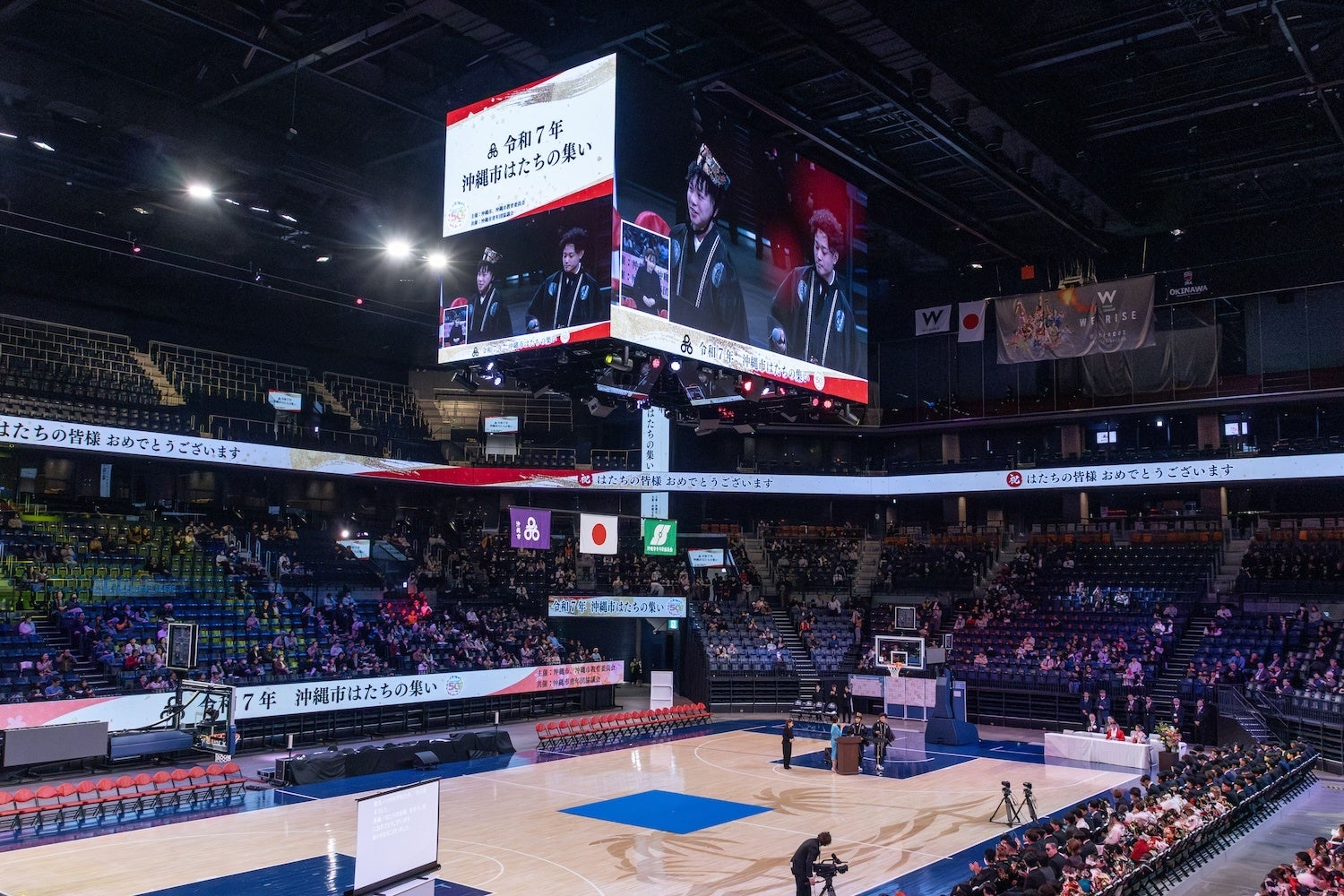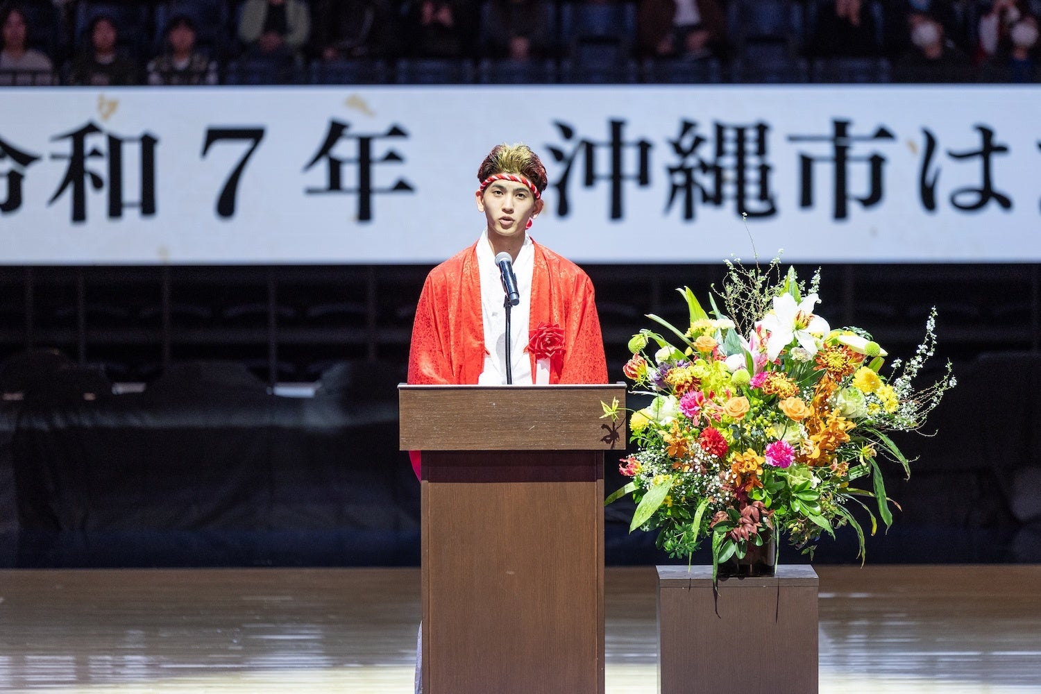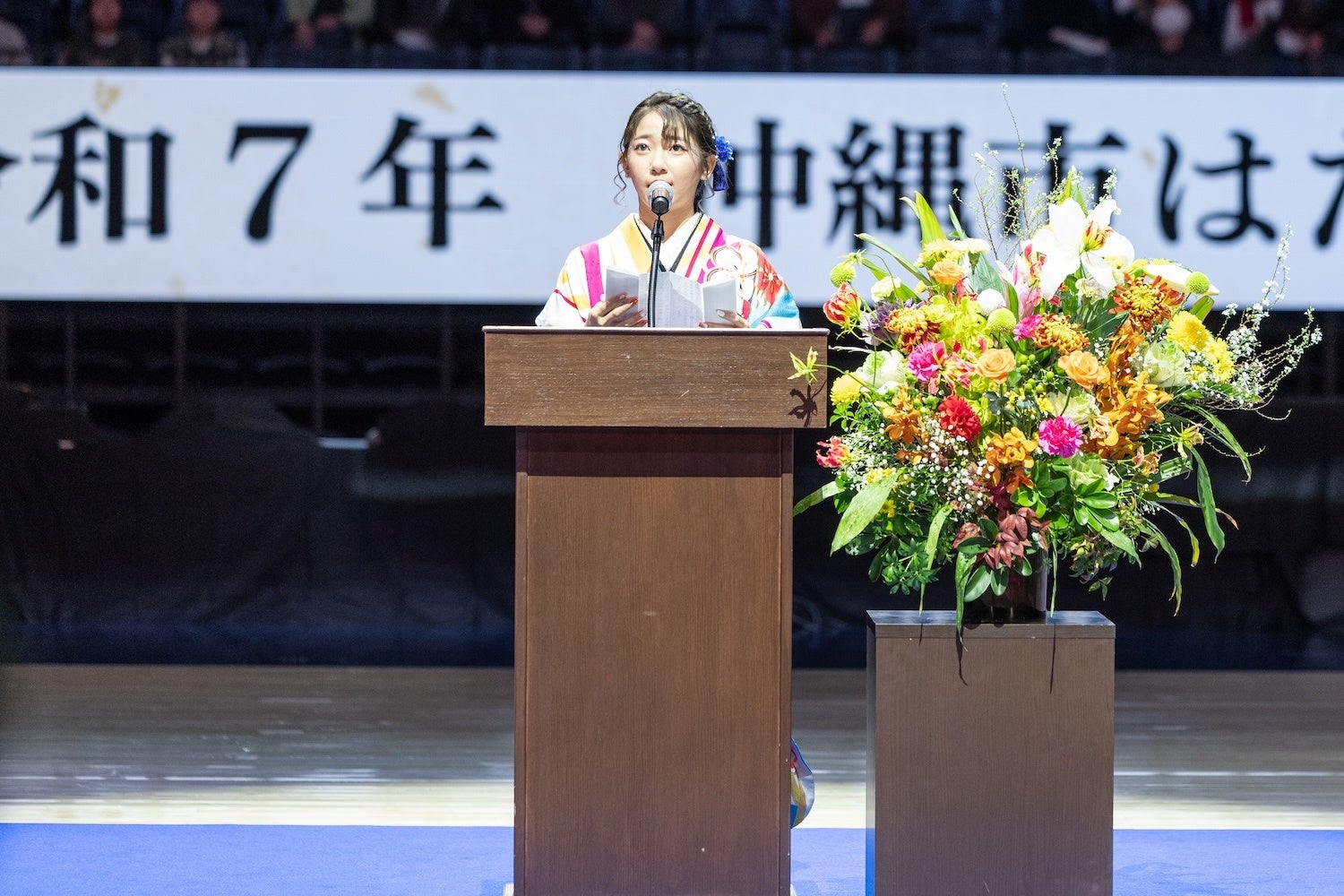 会場は、バスケットコートを舞台にした沖縄アリーナらしいレイアウトで設営され、沖縄市の市歌斉唱に始まり、平田嗣巳沖縄市副市長ならびにご来賓の皆さまからの祝辞、新成人代表による力強い抱負の発表が行われました。