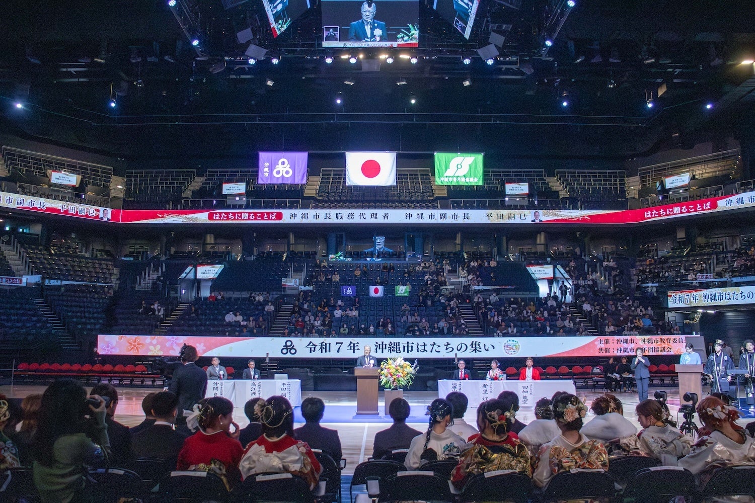 1月12日(日)、令和7年「沖縄市はたちの集い」が沖縄アリーナにて開催されました。本イベントは沖縄アリーナでの開催が3回目となり、新成人1,145名とそのご家族628名を含む、約1,800名の皆さまにご参加いただいた大規模な式典となりました。