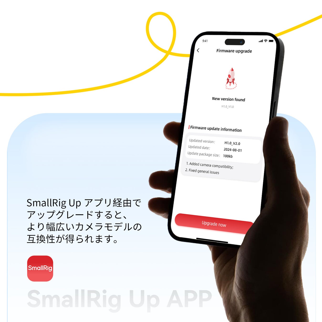 SmallRig Upアプリを使用してアップグレードすることで、さらに多くのカメラモデルと互換性を持つことができます。強力な内蔵バッテリーは最大40時間の長時間使用が可能で、USB-C経由で2.5時間でフル充電できます。