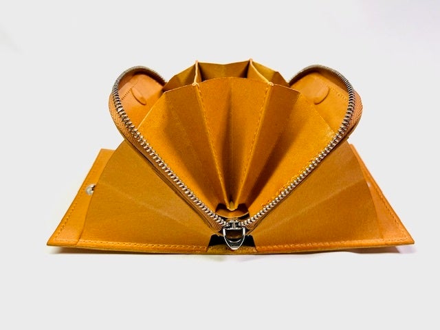 蛇腹のような側面は、扇や折り紙を彷彿とさせますね。手のひらサイズのコインケース外側には紙幣収納スペースを(左右フラップ式)設け、紙幣を折らずに収納可能なデザインになっています。
