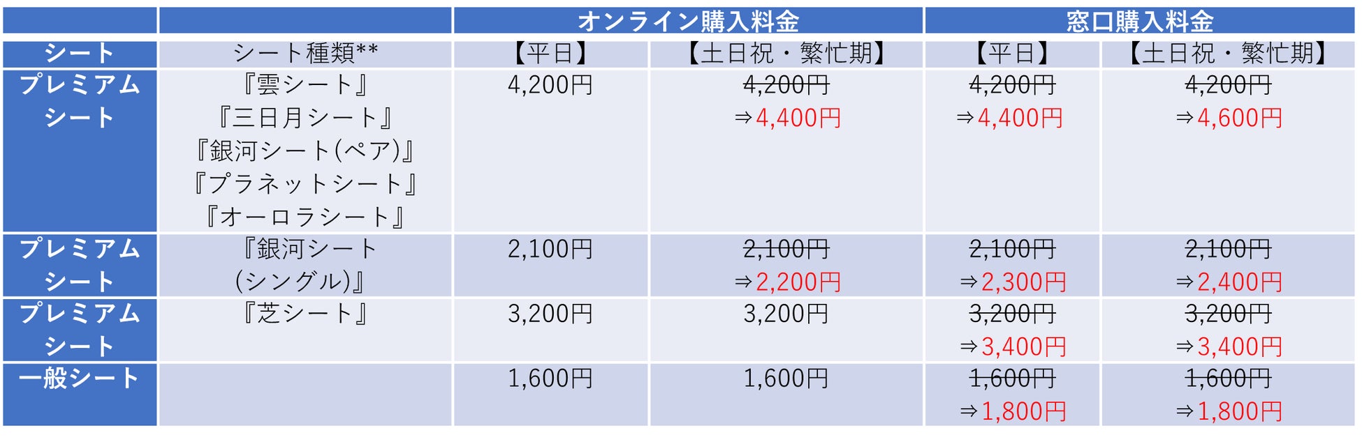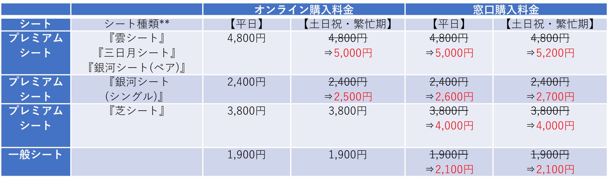 当社では人件費や原価の高騰を背景に、これまで通りの安定したサービス内容をお客様に提供することを目的に、窓口でのチケット購入価格および一部座席の価格改定を実施することといたしました。