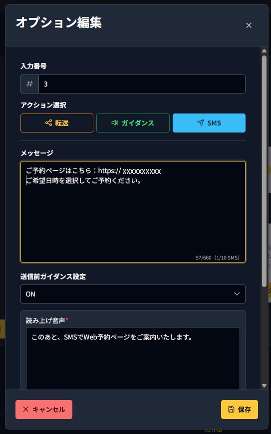IVRで「予約のキャンセルや変更をご希望の方は1を押してください。」とガイダンスを流し「ご予約内容の確認・変更はこちら:https://xxxxxxxxxxxxx」という内容のSMSを送信します。