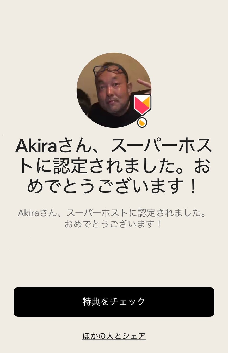 「この度、Airbnb においてスーパーホスト認定をいただきましたことを心より嬉しく思います。
