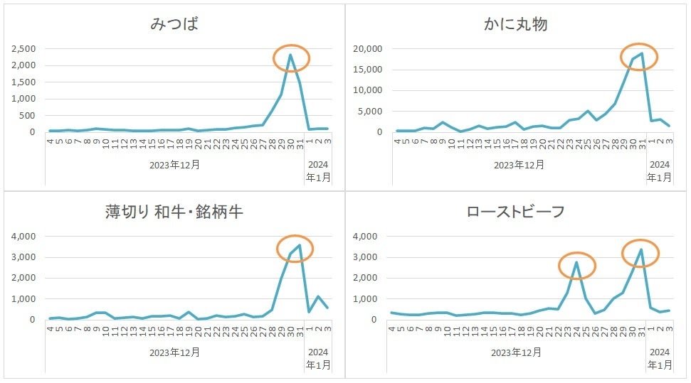 年末30日や31日には、鮮度が重視される食品の購入が急増します。例えば、「みつば」や「かに丸物」、「薄切り 和牛・銘柄牛」、「ローストビーフ」などです。これらは新鮮な状態で手に入れたいというニーズから、年始直前に購入される傾向があると考えられます。