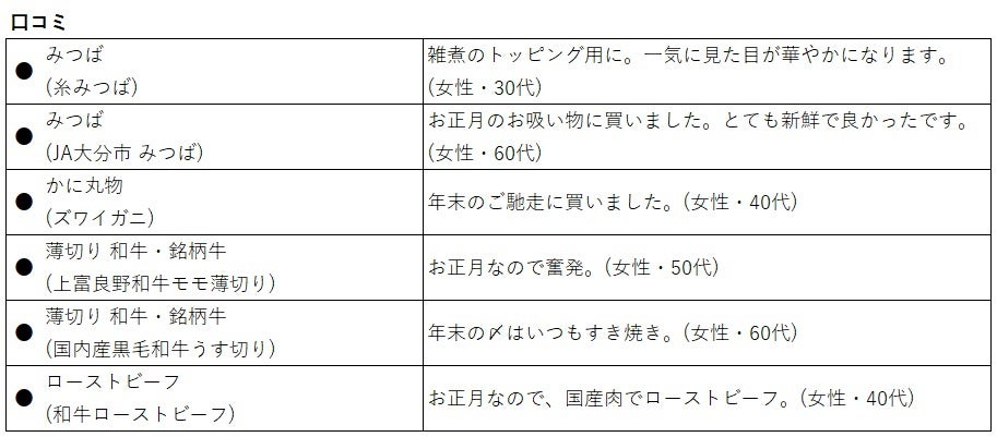 みつばについての口コミからは、「雑煮のトッピング用に。一気に見た目が華やかになります」、「お正月のお吸い物に買いました。とても新鮮で良かったです」といった声が寄せられています。また、かに丸物では「年末のご馳走」という声や、薄切り 和牛・銘柄牛では「お正月なので奮発」といった声も見られます。これらの食品は、先程の“保存ができるので安いうちに計画的に買われている食品”とは変わり、値段が高くても新鮮で良いものを買って楽しんでいる方も多いのではないでしょうか。