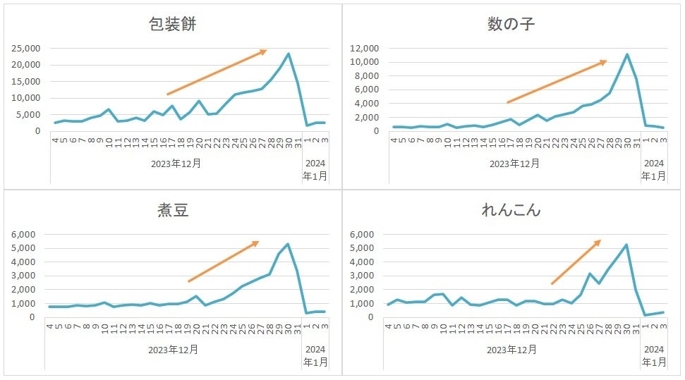 また、「かに丸物」、「いくら」なども、年末年始の特別な期間に、家族や親しい人々と過ごす時間に華を添えるための食品として選ばれていると想像されます。手軽に賑やかな食卓を演出できる「オードブル」も人気のようです。