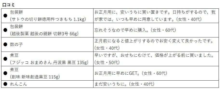 年末年始に備えた食品の中でも、保存がきくものは12月後半から購入が徐々に増える傾向があります。例えば、「包装餅(鏡餅を含む)」や「数の子」、「煮豆」、「れんこん」などです。CODEユーザーの口コミでは、「お正月用に安いうちに買い置き」「忘れそうなので早めに購入」「正月前になると値上がりする」「価格が上がる前に買った」などの声があり、値段の変動もある中で、計画的に購入する人が目立ちます。