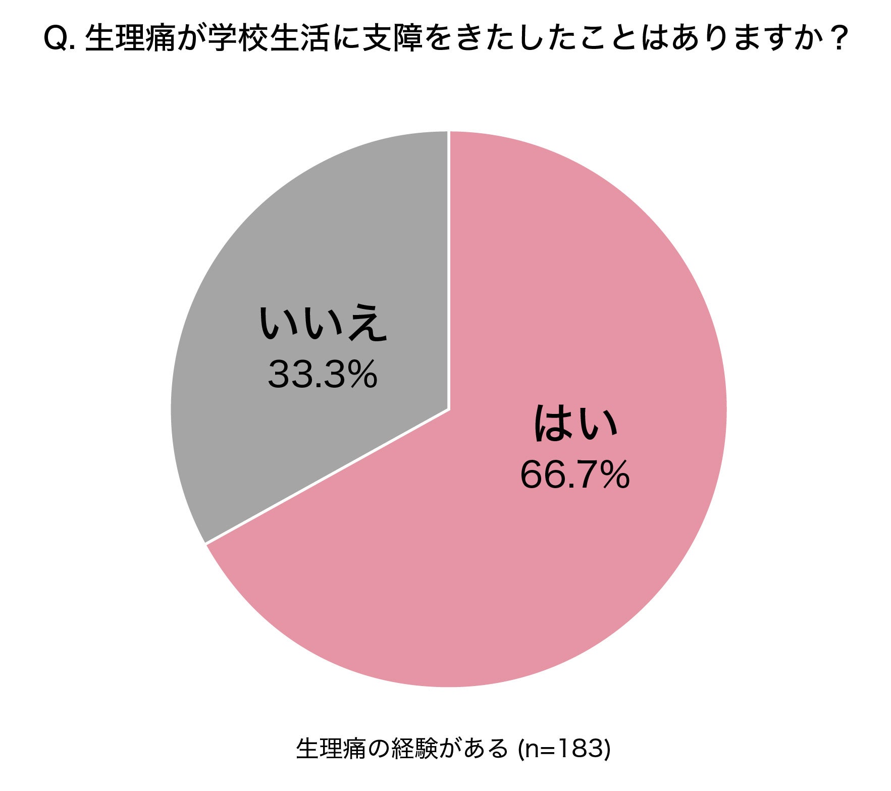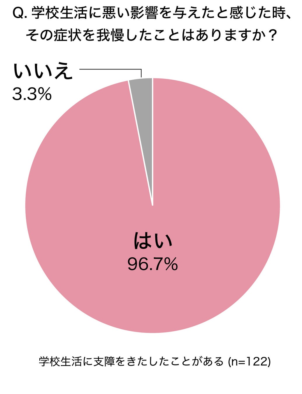 調査の結果、生理痛経験のある高校生の7割弱が「生理痛が学校生活に支障をきたしたことがある」と回答し[グラフ1] 、そのうち、96.7%がその症状を「我慢をしたことがある」と回答しました[グラフ2] 。