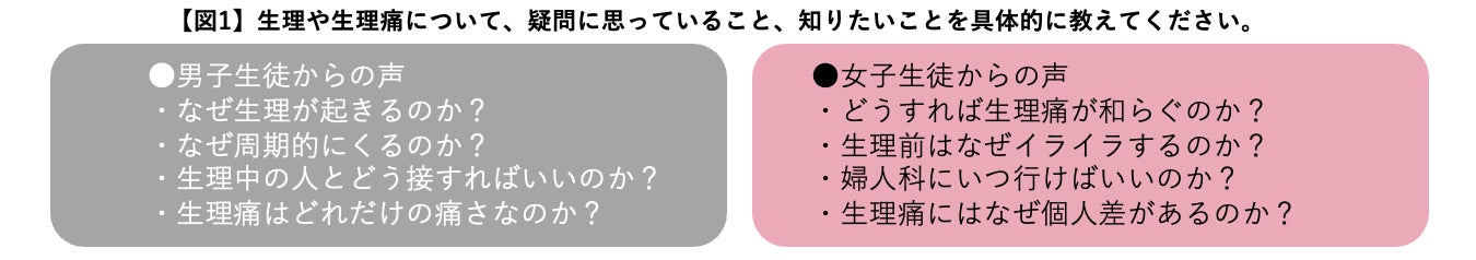 さらに、学校内で生理に困った時、担任や保健の先生にどういう対応をしてほしいか聞いたところ、「学校を休んでも欠席にならないようにしてほしい」「男性の先生も生理についてしっかり理解してほしい」などの要望が出ました。生理に関して疑問に思っていること、知りたいこととして、生理がある女子生徒からは「生理痛を和らげる方法」 「婦人科を受診するタイミング」を知りたいなどの声が上がり、一方、生理を経験していない男子生徒からは、「生理の時の接し方」や、そもそも「なぜ生理が起きるのか?」などの疑問が上がりました。[図1]