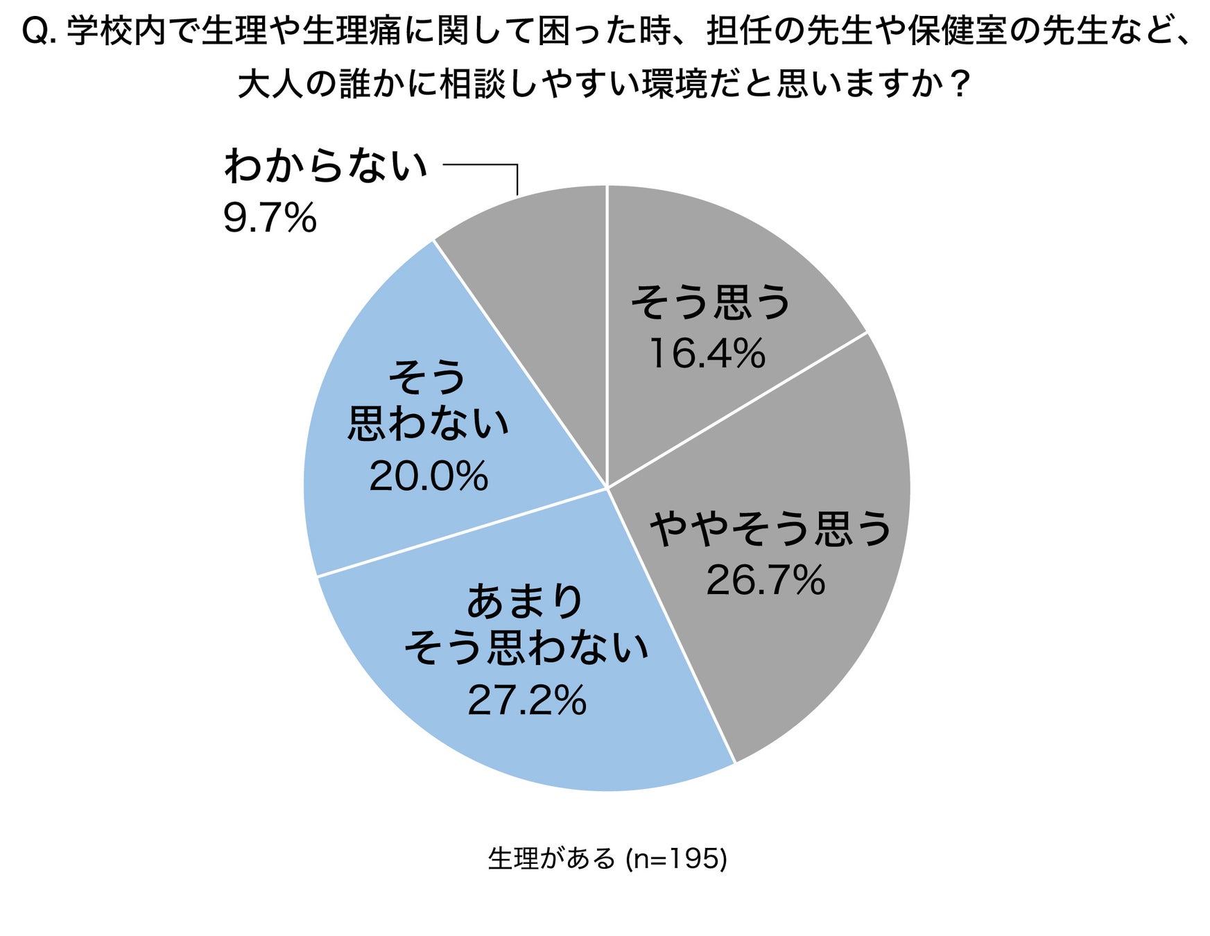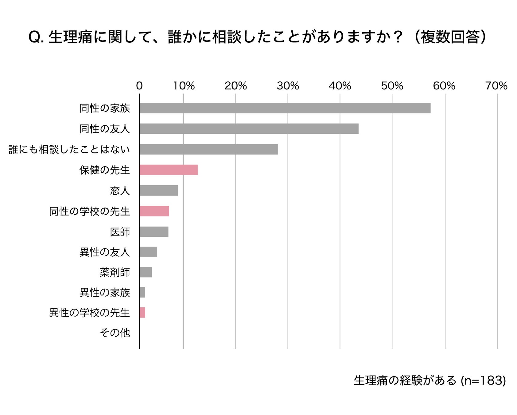 また、学校内で生理や生理痛に関して困った時、担任の先生や保健室の先生など、大人の誰かに相談しやすい環境だと思うかという質問に対し、「あまりそう思わない」「そう思わない」との回答は合わせて約5割にのぼりました[グラフ3]。生理痛に関して、誰かに相談したことがあるか聞いたところ、保健の先生に相談したことがある高校生は約1割、学校の先生への相談は1割未満にとどまりました[グラフ4]。