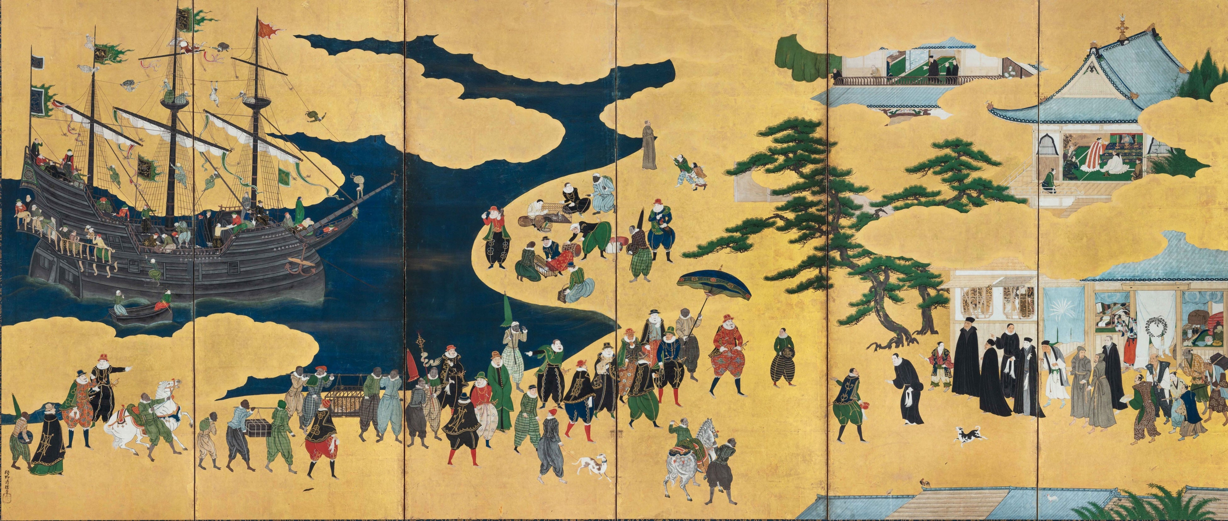 重要文化財 南蛮屏風(右隻)狩野内膳筆 桃山時代(16世紀末~17世紀初期)神戸市立博物館蔵(池長孟コレクション) |