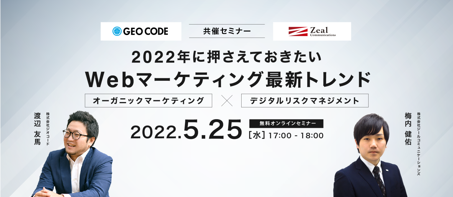 Webマーケティングとクラウドセールステック(営業DX)を展開する株式会社ジオコード(本社:東京都新宿区、代表取締役:原口 大輔、証券コード:7357)は、5月25日(水)に株式会社ジールコミュニケーションズと共催セミナー「2022年に押さえておきたいWebマーケティング最新トレンド」をオンラインで開催します。