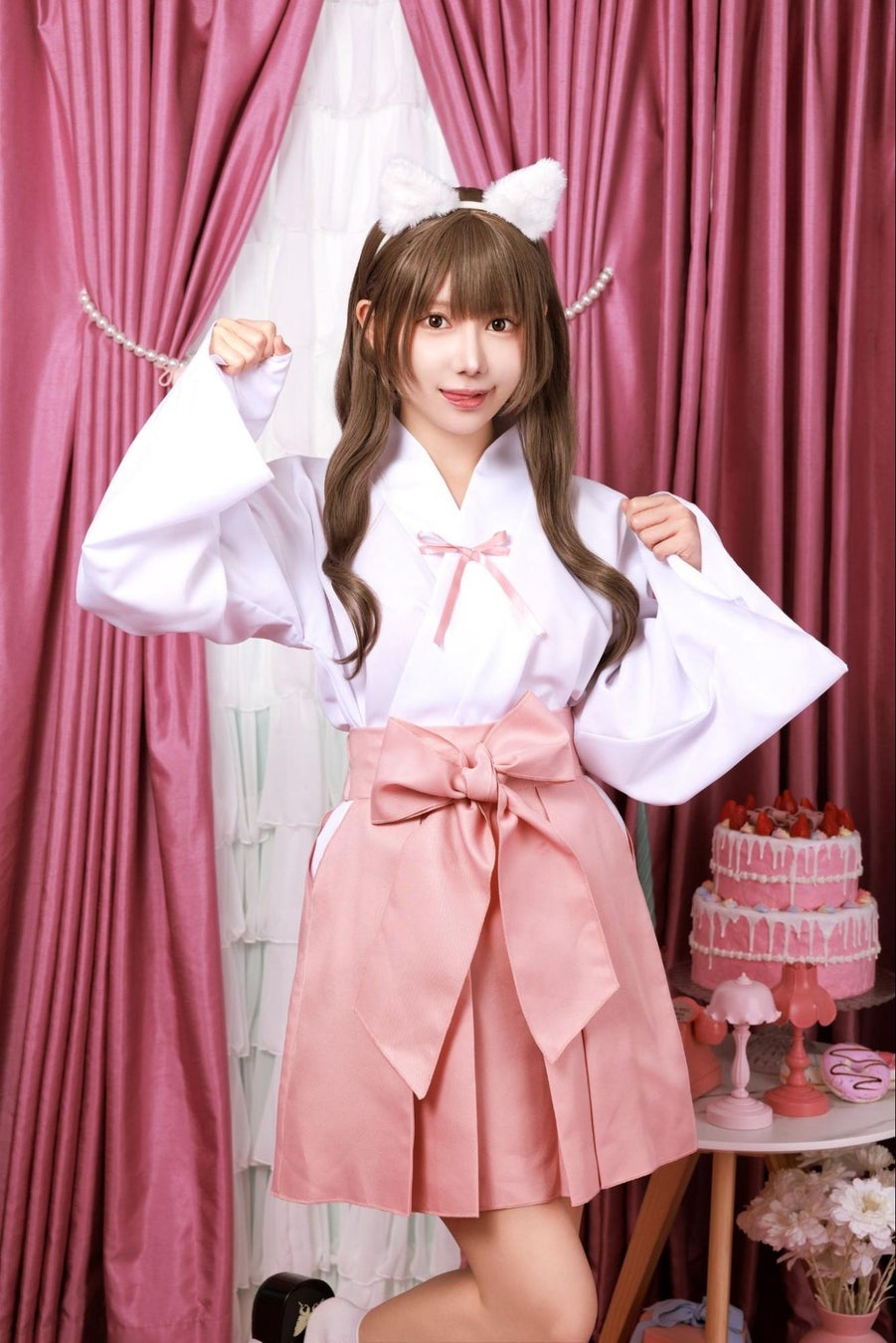 ふわふわの白猫耳とピンクの巫女装束を組み合わせた、愛らしさ抜群のコスチューム。