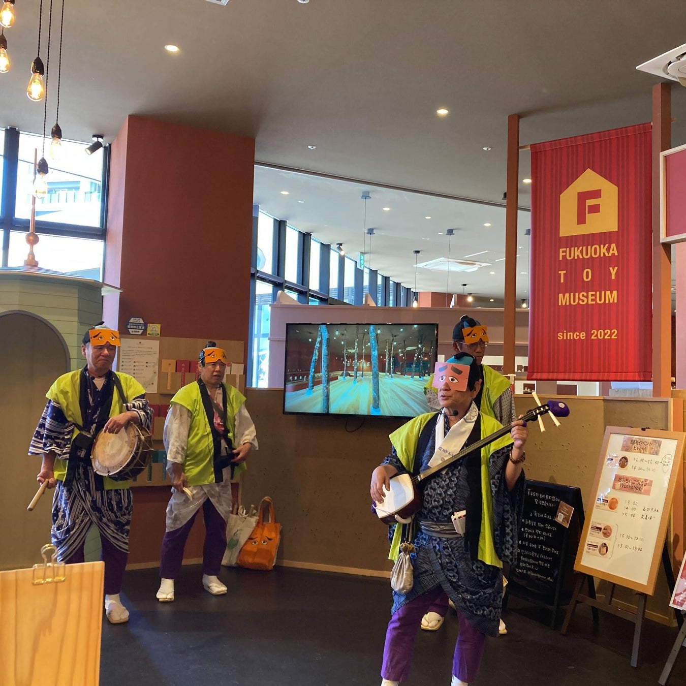 福岡おもちゃ美術館3周年のお祝いをしに、にわかたい「ふらんけん」がおもちゃ美術館でどんたく囃子とにわかの披露をしてくれます。