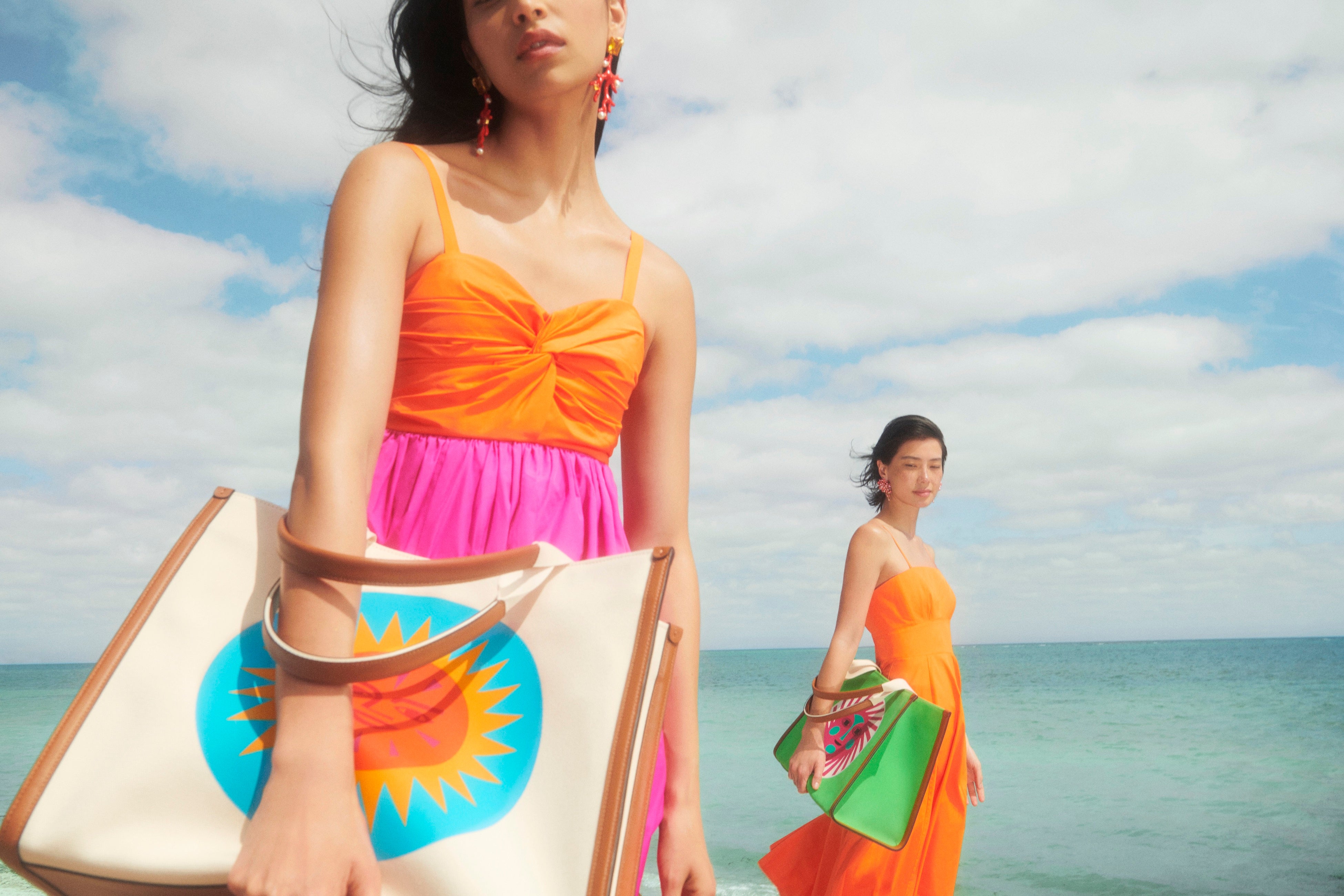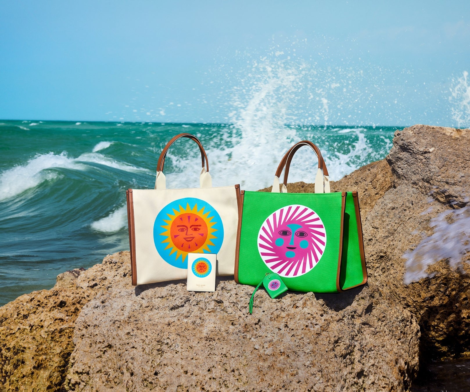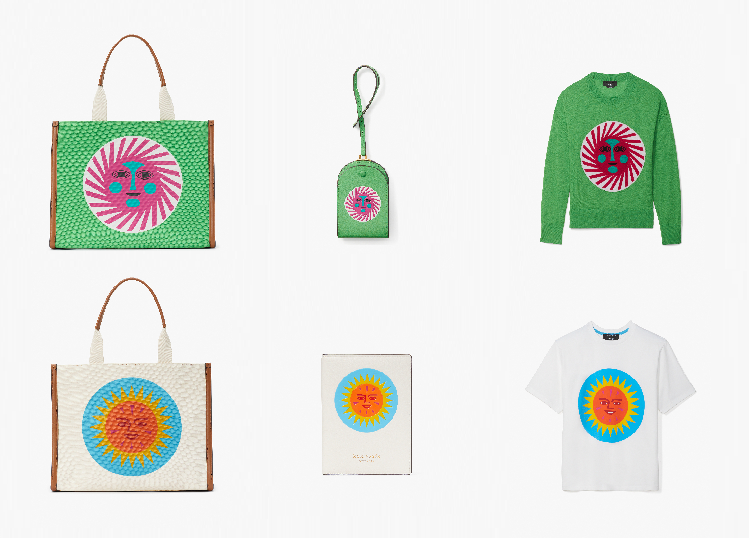 鮮やかな太陽プリントは、明るいカラーリングのラージトートから、ニットやTシャツ、そして持ち運べるアート作品としての旅行アイテムのパスポートホルダー、ラゲッジタグまでカテゴリーを跨いで展開されます。