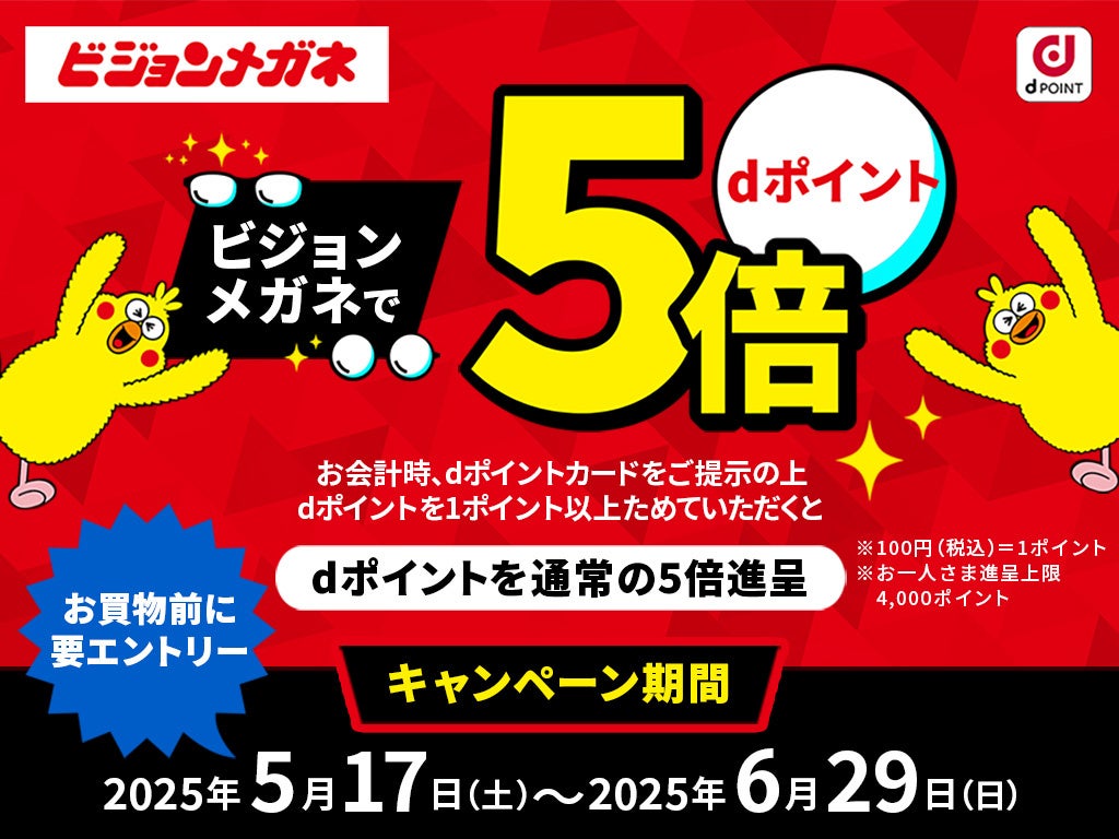 ビジョンメガネ、「dポイント」5倍キャンペーン実施 全国98店舗で5月17日~ 夏の行楽シーズンに向けて、眼鏡やサングラスをお得にゲット!