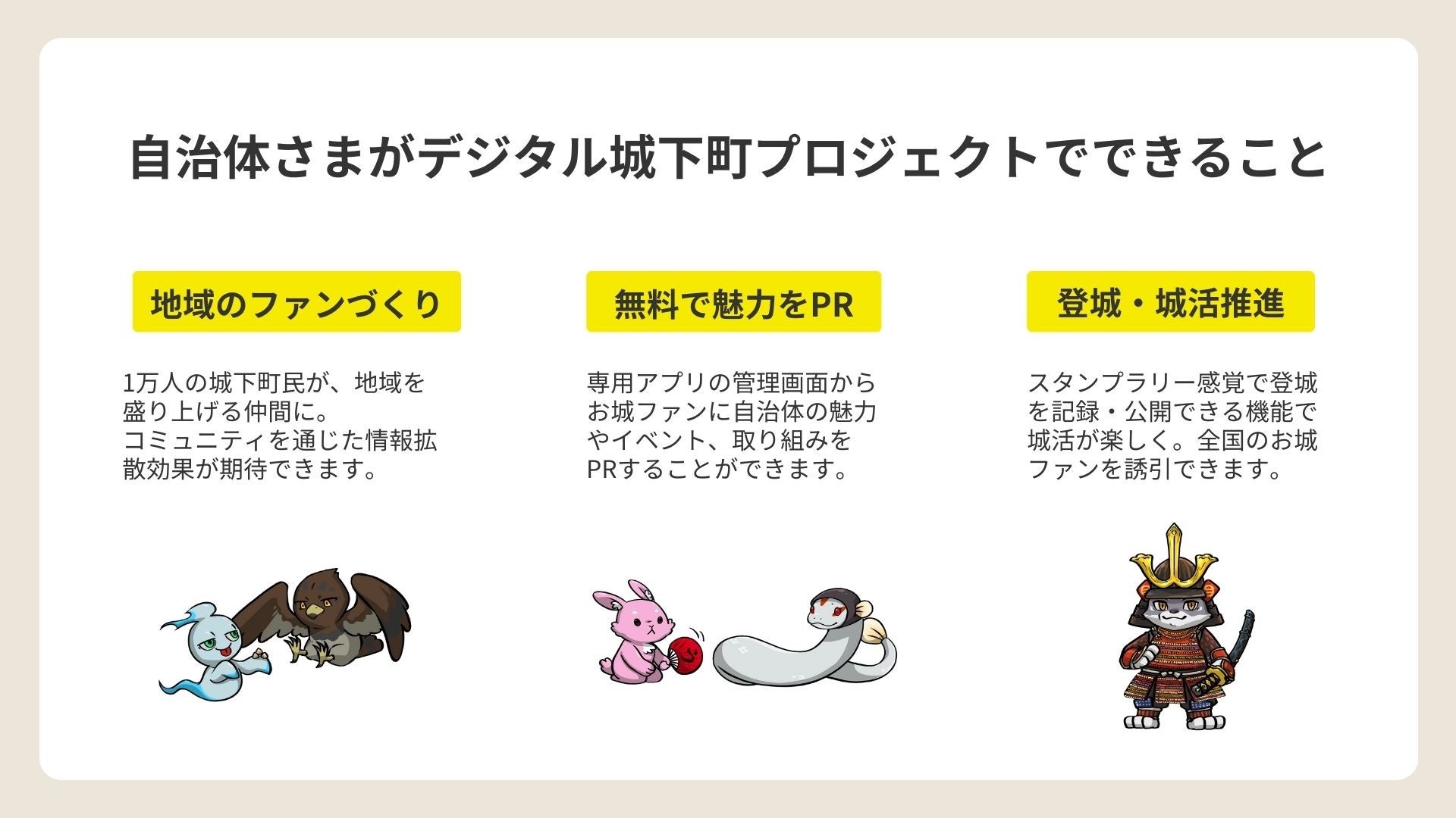 さらに今後は、「デジタル城下町プロジェクト」に参加する自治体が、地域のイベント情報などをコミュニティに対して発信できる機能を追加予定(開発中)。全国のお城ファンで構成されるコミュニティへ効率的に情報を届けることで、地域の歴史文化・自然・観光資源の「ファン」を増やし、地域活性化にご活用いただけるプラットフォームになることを目指しています。