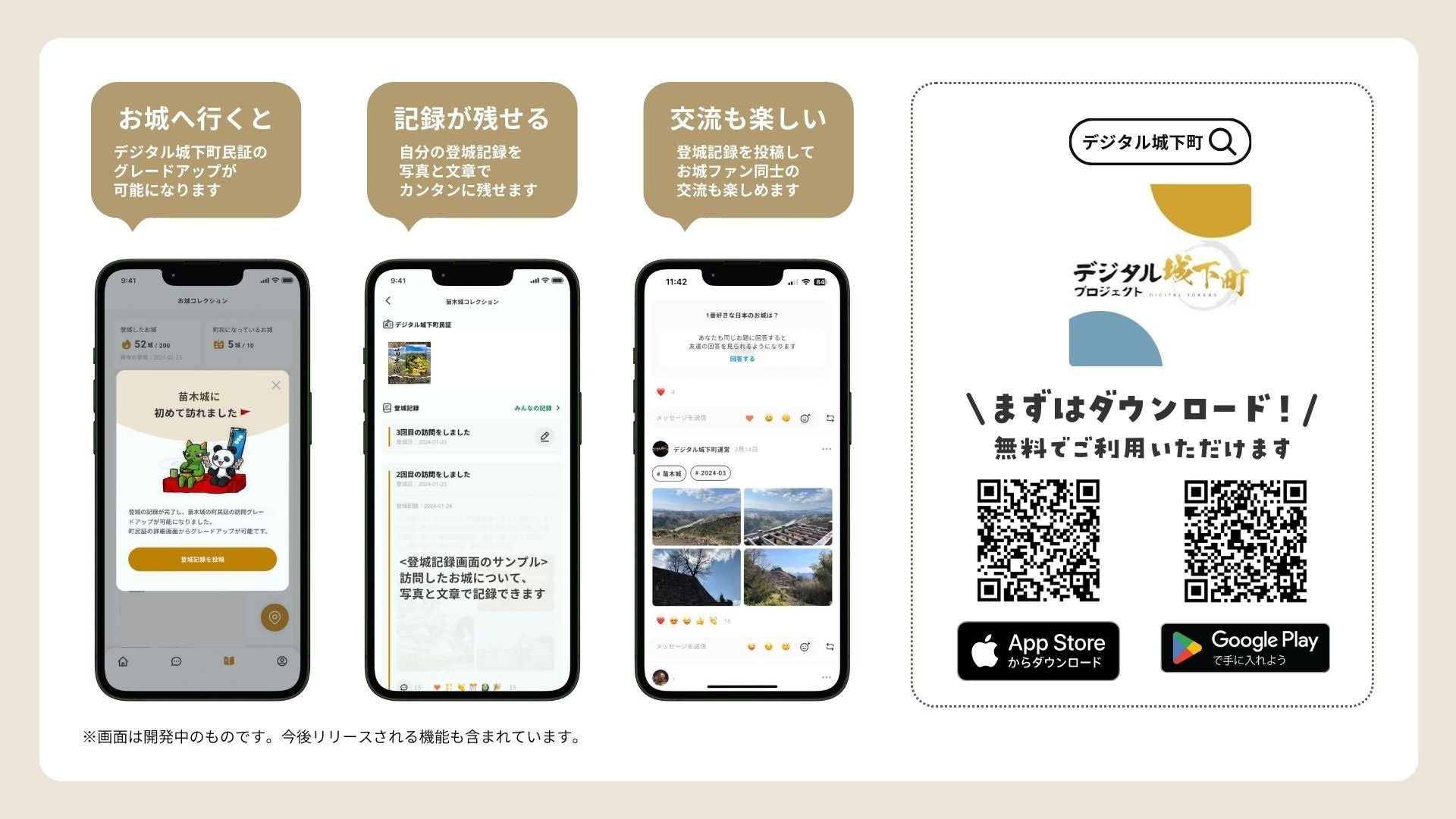 アプリは全国200城の「登城記録」を残せる機能、「城活」を報告できる機能などを備えており、お城ファンが気軽にコミュニケーションを楽しめる場となっています。また、アプリとデジタル城下町民証を連携することで、登城・プロジェクトへの支援時に城下町民証をグレードアップすることが可能です。城下町民証は複数保有することができるため、御城印を集めるようにコレクションできることも、お城ファンにとって大きな魅力となります。