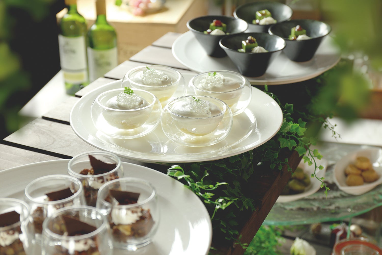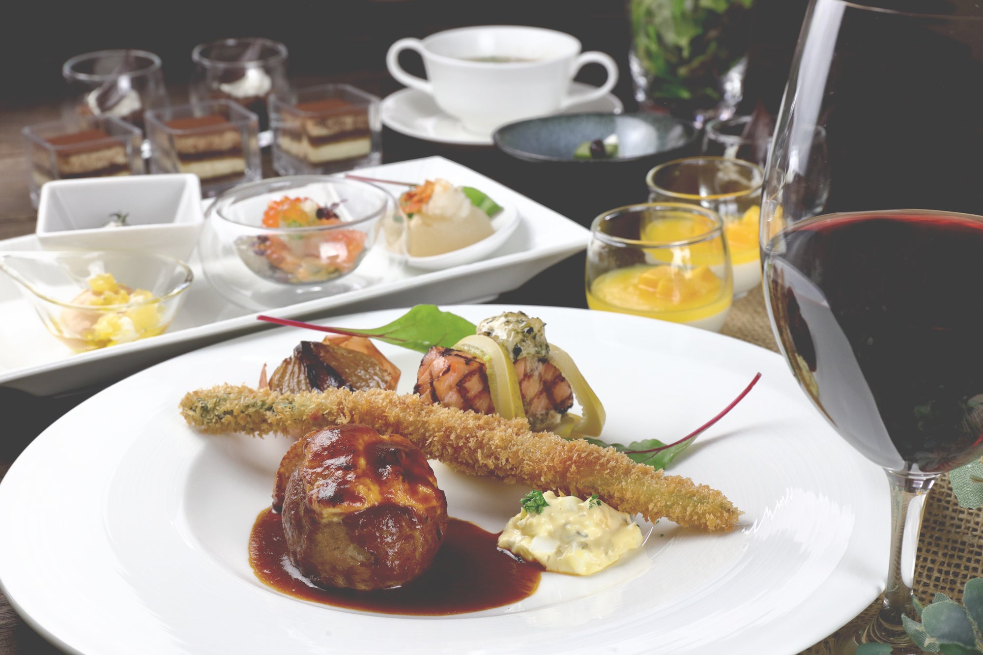 パン、ライス、スープ、スープカレー、サラダ、フルーツ、パティシエ特製デザート、ワイン(赤、白、スパーク リング)やコーヒーなどのドリンクバー。