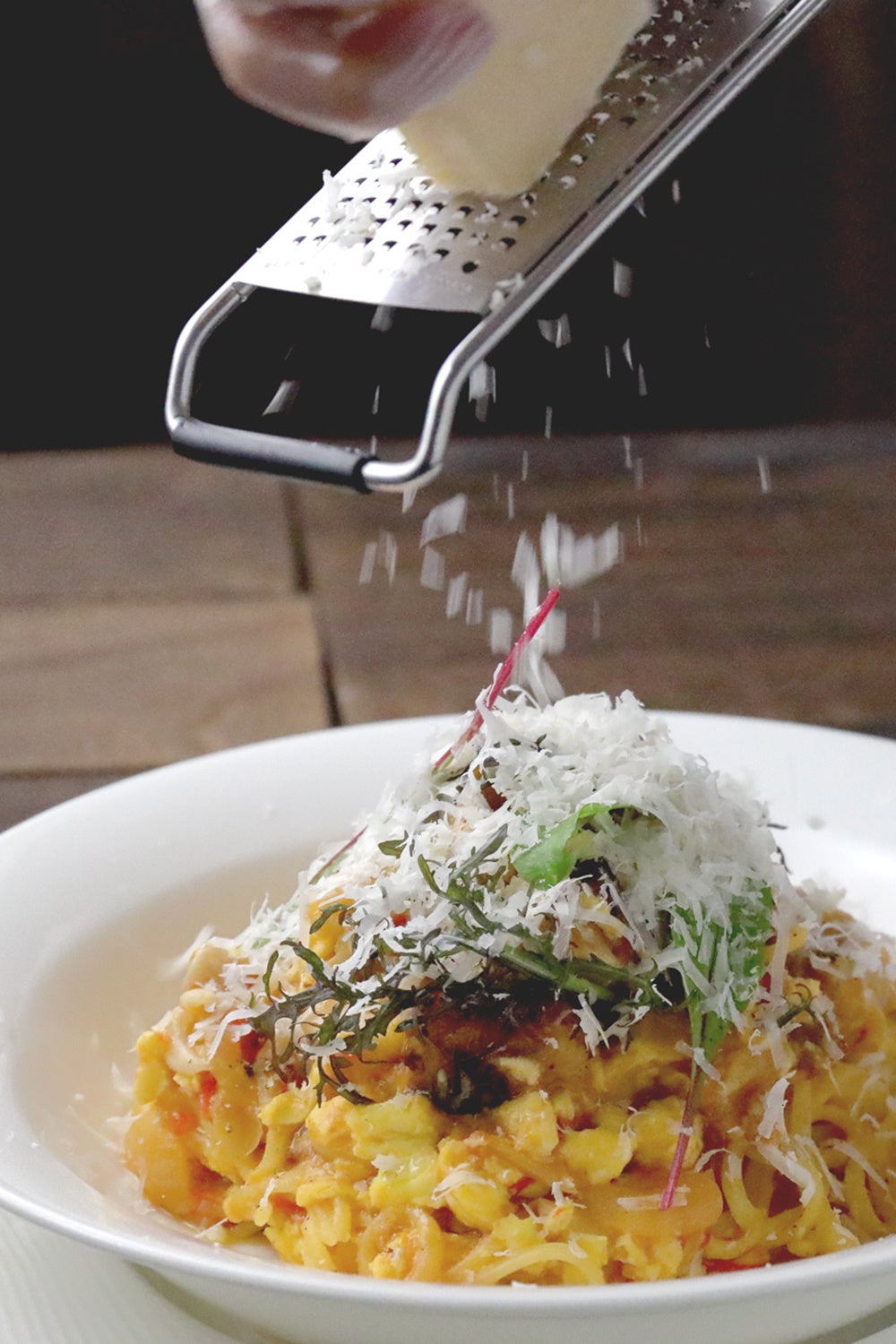 ジューシーな知床鶏と相性抜群のソースと濃厚なチーズを、ボリューム感ある平打ち麺で味わう特製パスタ。
