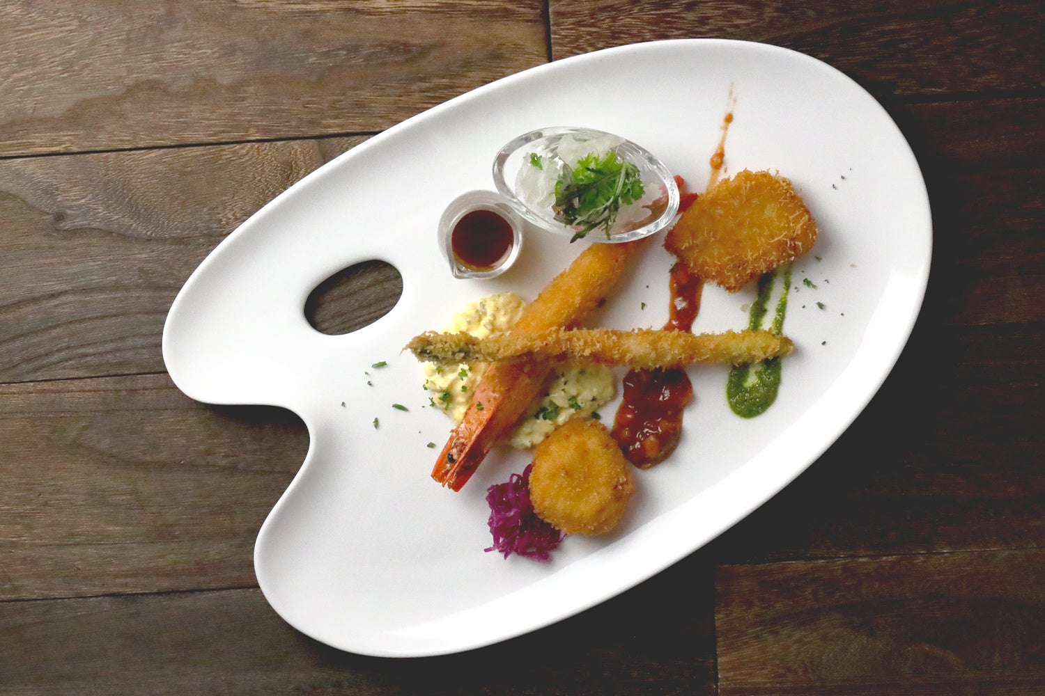 エビフライ、ズワイ蟹のクリームコロッケ、カジキマグロのカダイフ包みなどを、ソースと共に彩りよくパレットに配しました。