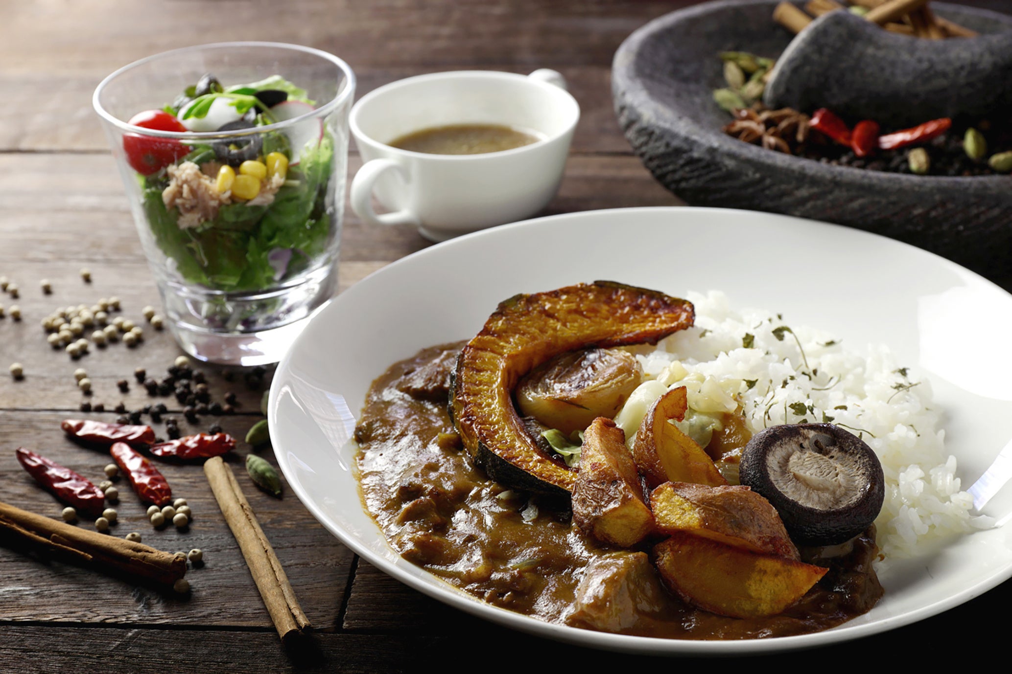 黒毛和牛の旨味に、玉ねぎとフルーツの甘味とスパイスが溶け込んだ大人のカレー。付け合わせの野菜も含め、北海道産の食材をふんだんに使用しています。