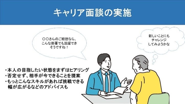 シニア再雇用では「一方的に配属先を決められた」「年収が下がった」「現役時代の部下から指示を受けてストレス」など当事者がモヤモヤとした思いを抱えるケースも少なくありません。働く意義を見出す上で、本人のやりたいこと、できることを一緒に整理し、伴走する人材が必要です。当社は企業に代わって、キャリアコンサルタントの国家資格を持つ人材などによるキャリア面談を実施できます。