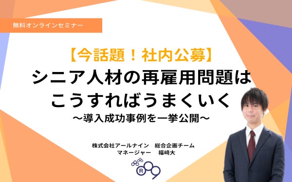 企業の採用、人材育成を支援する株式会社アールナイン(本社:東京都港区、代表取締役:長井亮)は7月18日、シニア世代の再雇用活性化のポイントを伝えるオンラインセミナーを開きます。高齢化が進む中、社内から必要な人材を募る「社内公募制度」をシニア世代に拡大する企業も増える一方、社内の認知度の低さや、意欲と仕事内容のマッチングなどで難しさを伴うのも実情です。当社は面談や研修でシニア再雇用を含む社内公募制度の活性化や、キャリア形成支援の土壌づくりをサポートしています。