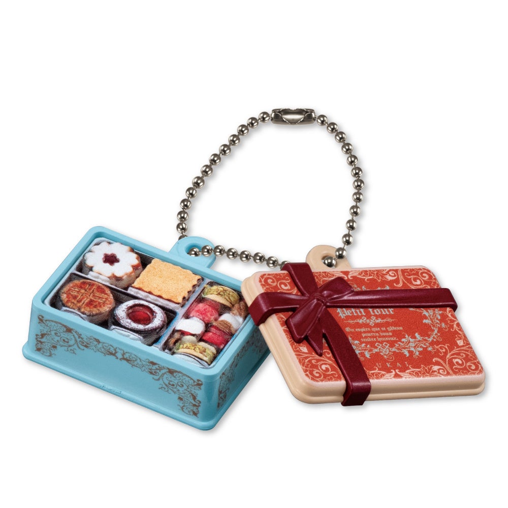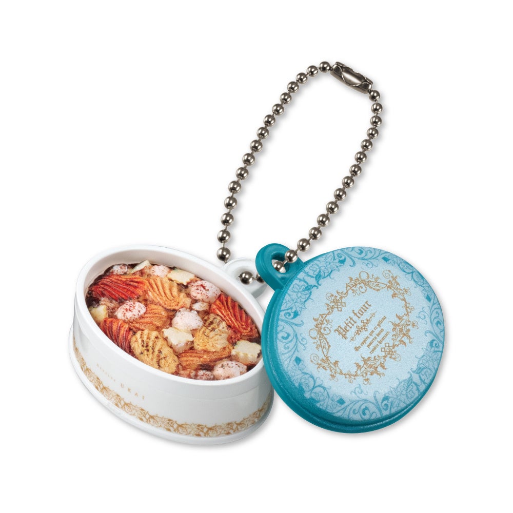パッケージやクッキーの細部までリアルに再現しました。蓋を開けると焼き菓子がぎっしりと詰まっています。ボールチェーン付きで、バッグやポーチにつけていつも持ち歩くことも可能。ぜひお早めにチェックしてください。