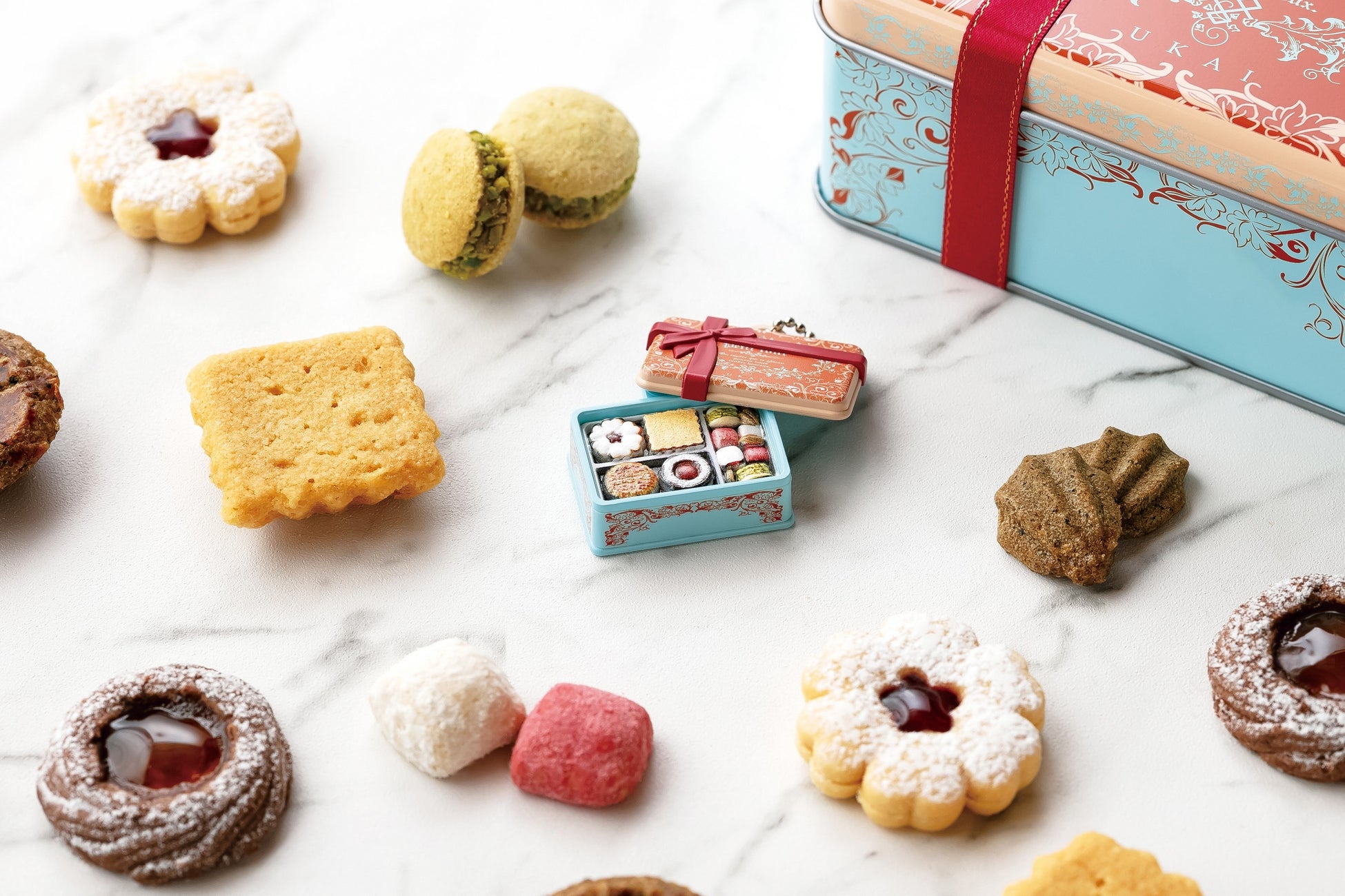 レストランでの感動と余韻をご家庭でも味わっていただけるよう「うかいの余韻をご家庭へ」をコンセプトに掲げる「アトリエうかい」のクッキー。ミニチュアチャームとなってカプセルトイで登場するのは、定番のフールセックやふきよせ4種と過去にご好評をいただいた限定商品2種の計6種類。