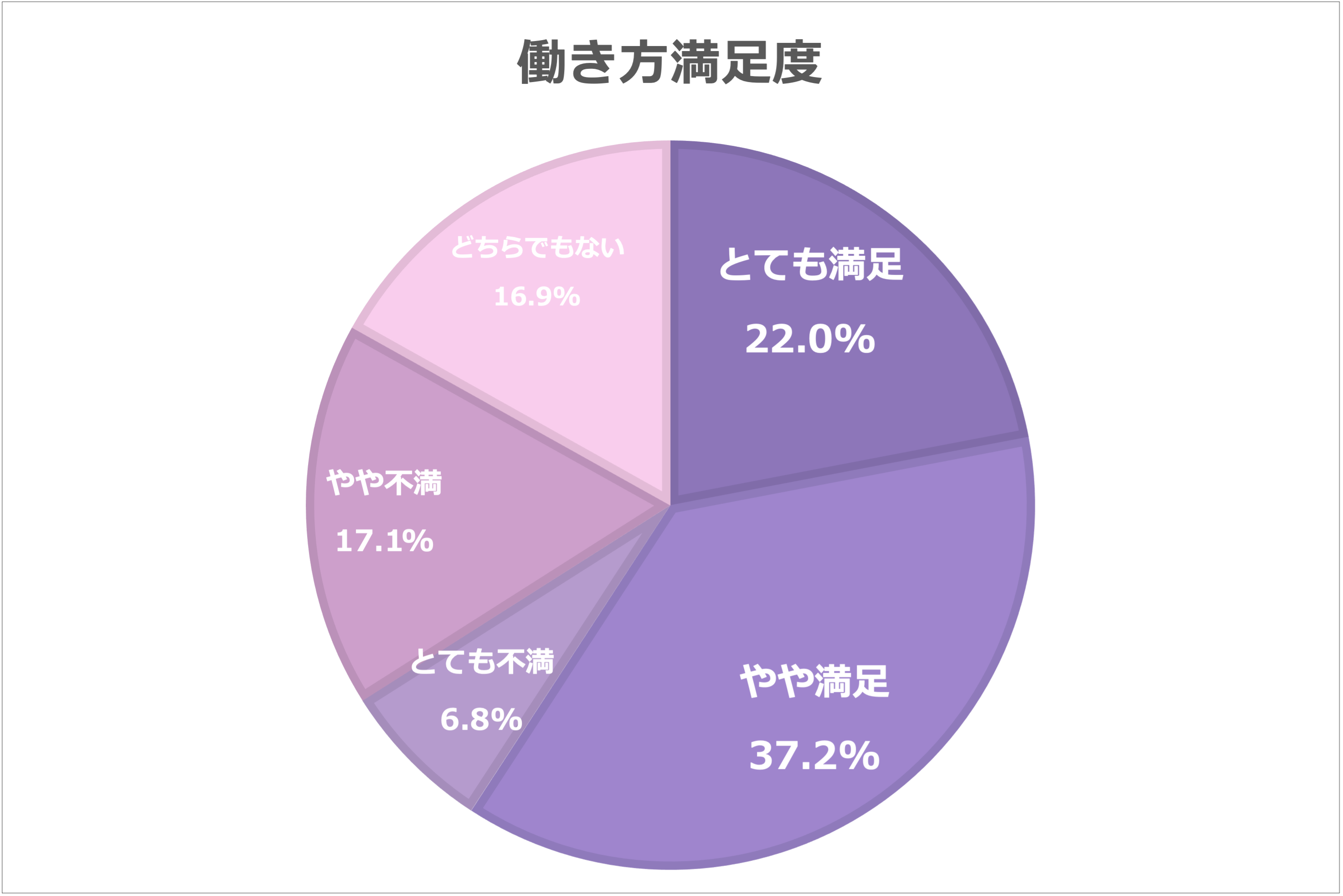 現在の職場での働き方満足度について、全体の22.0%が「とても満足」で、37.2%が「やや満足」と回答し、合算した59.2%が満足派の回答結果になりました。また、男女別に見ると満足派の回答に差が見られ、男性は64.9%、女性は53.1%の回答になり、さらに「とても満足」の回答の差は顕著で、男性が28.8%のところ女性は14.8%にとどまる結果になりました。
