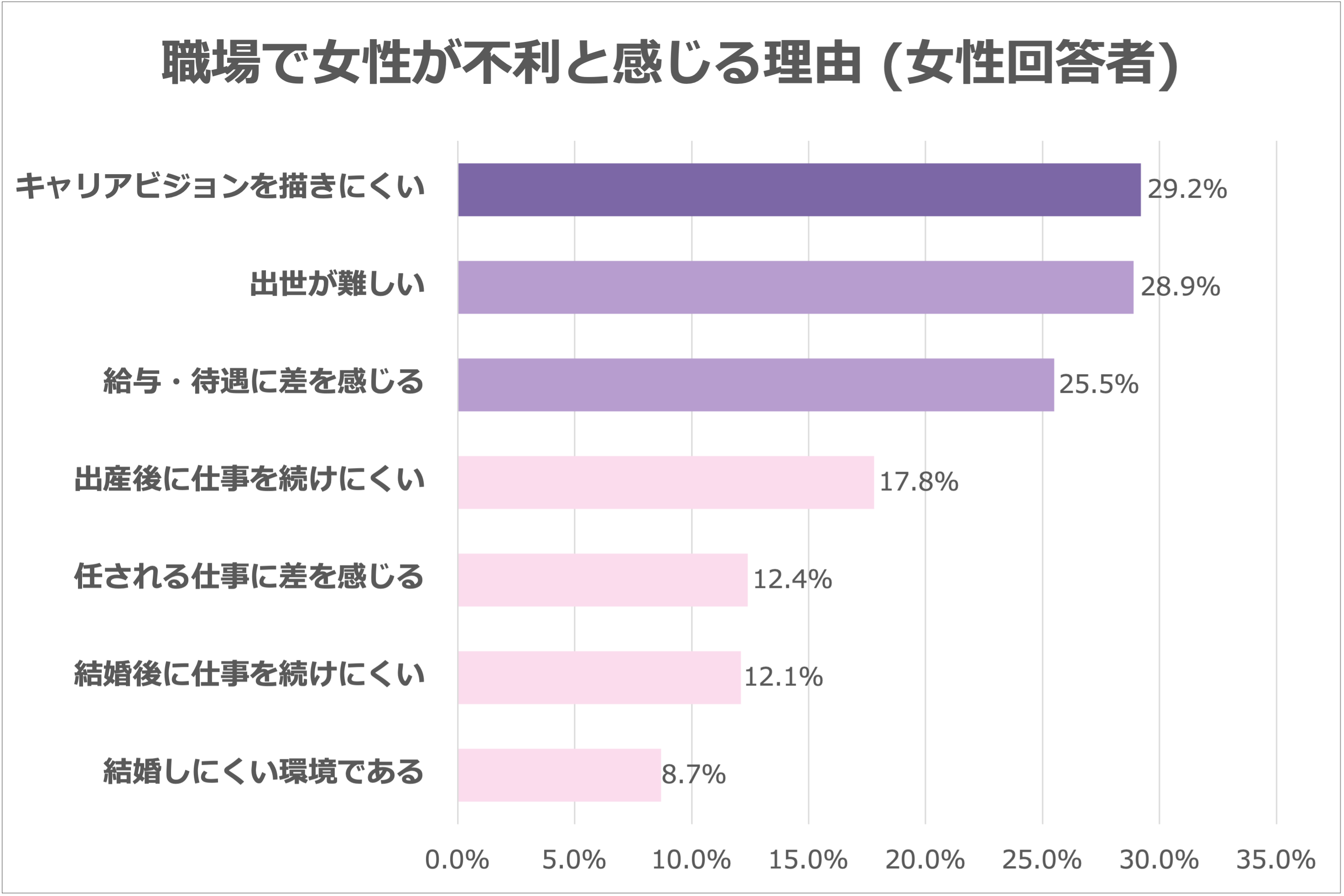 また、不利だと感じる理由について女性の回答では「キャリアビジョンを描きにくい」が29.2%と最多で、次いで「出世が難しい」が28.9%、「給与や待遇に差を感じる」が25.5%と上位3つの回答結果になりました。最も少ない回答だったのは8.7%の「結婚しにくい環境」でした。